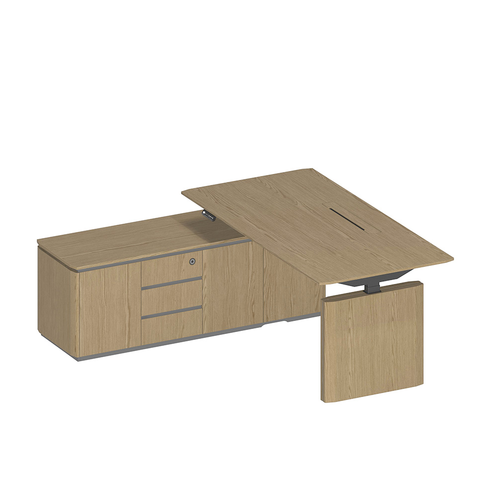 • Подъемный электрический механизм в столах руководителя для работы «сидя-стоя» с памятью четырёх уровней высоты, которые легко устанавливаются кнопками, что создает дополнительный комфорт в течении рабочего дня.