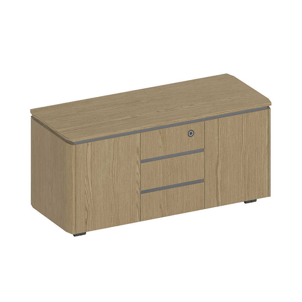 Скругленные формы столешниц, топов шкафов, крышек тумб, опор столов и боковых декоративных стенок шкафов и тумб; на панелях выдвижных ящиков эстетичный скошенный край для удобства пользования тумбами.