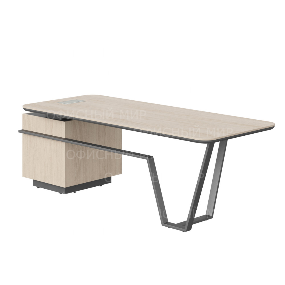 Столешница комбинированная, общая толщина - 37 мм. Верхняя часть из МДФ т.12мм, покрытие - шпон. Нижняя часть из окрашенного МДФ т.25мм, имеет фрезерованный скос по внешнему краю. Каркас тумбы из ЛДСП т.18мм, кромка ABS т.0.8мм. Декоративные боковые стенки и задняя стенка тумбы - из МДФ т.12мм, покрытие - шпон. Фасады тумб - фрезерованное МДФ т.19мм, покрытие - шпон, декоративные вставки - покрытие цветной эмалью. Ящики из ЛДСП, скрытые шариковые направляющие полного выдвижения с системой открывания "push to open". Опоры из металла 20х60 мм, толщина металла 1,5 мм, покрытие порошковой краской. Столешницы оснащены встраиваемым блоком розеток, корпус блока - алюминий, дополнен крышкой и защитными щеточками. Внутри блока - сетевые розетки, USB и сетевые порты.