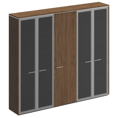 Столешницы рабочих и переговорных столов, брифинг - приставок выполнены из МДФ толщиной 34 мм, фанерованного шпоном дуба. Опоры столов выполнены из полированной нержавеющей стали. Лицевая металлическая фурнитура выполнена в декоре «хром глянец». Стеклянные алюминиевые рамочные фасады выполнены в глянцевом декоре в сочетании с матированным стеклом серого дымчатого оттенка. Тангенциальный рисунок шпона дуба в табачной тонировке максимально подчеркивает текстуру натурального материала. Декоративные боковые панели и топы шкафов (единые на группу из нескольких шкафов) также фанерованы шпоном дуба, что придает шкафной композиции законченный вид, а всему кабинету статусность и солидность.