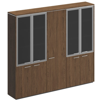 Столешницы рабочих и переговорных столов, брифинг - приставок выполнены из МДФ толщиной 34 мм, фанерованного шпоном дуба. Опоры столов выполнены из полированной нержавеющей стали. Лицевая металлическая фурнитура выполнена в декоре «хром глянец». Стеклянные алюминиевые рамочные фасады выполнены в глянцевом декоре в сочетании с матированным стеклом серого дымчатого оттенка. Тангенциальный рисунок шпона дуба в табачной тонировке максимально подчеркивает текстуру натурального материала. Декоративные боковые панели и топы шкафов (единые на группу из нескольких шкафов) также фанерованы шпоном дуба, что придает шкафной композиции законченный вид, а всему кабинету статусность и солидность.