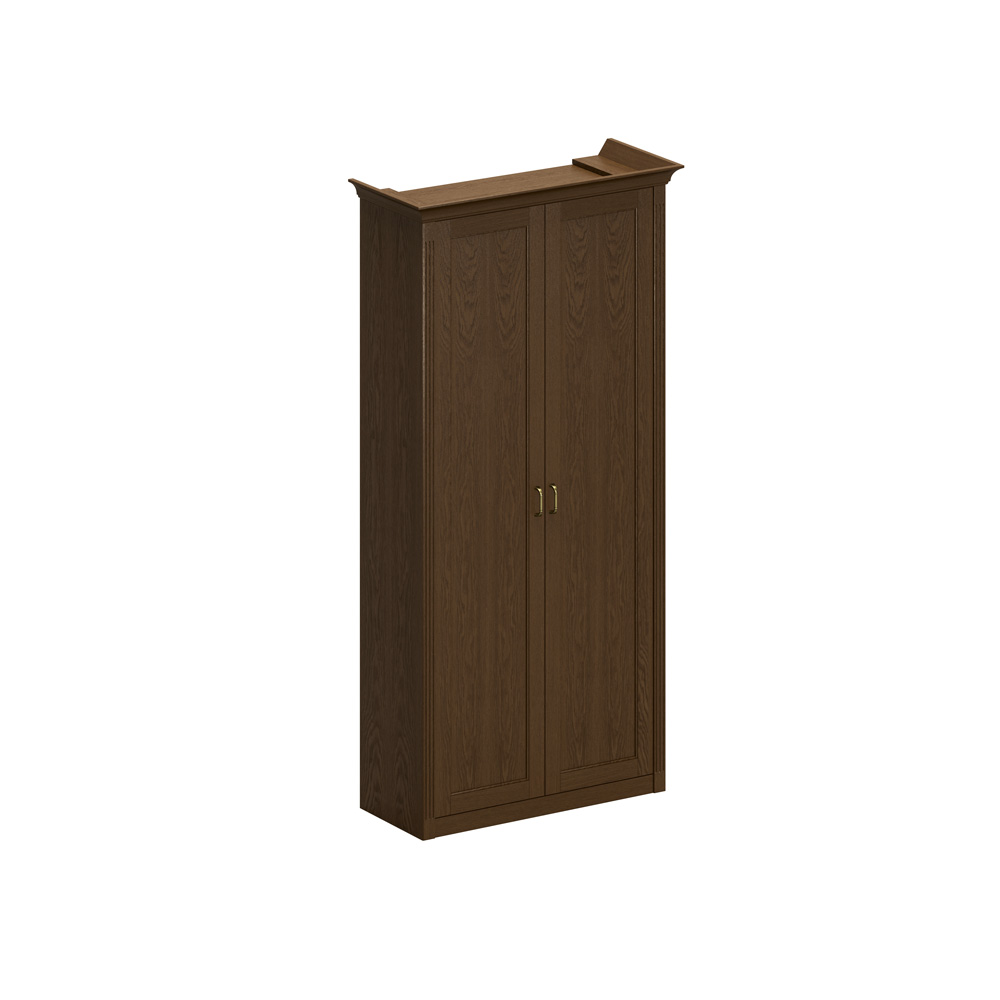 • Боковые и промежуточные декоративные панели шкафов выполнены из шпонированной плиты МДФ с брусками утолщения из плитных материалов и имеют общую толщину 50 мм; фронтальные лицевые торцы панелей обложены массивом дуба с продольными декоративными канелюрами.