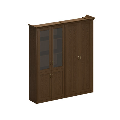 • Боковые и промежуточные декоративные панели шкафов выполнены из шпонированной плиты МДФ с брусками утолщения из плитных материалов и имеют общую толщину 50 мм; фронтальные лицевые торцы панелей обложены массивом дуба с продольными декоративными канелюрами.