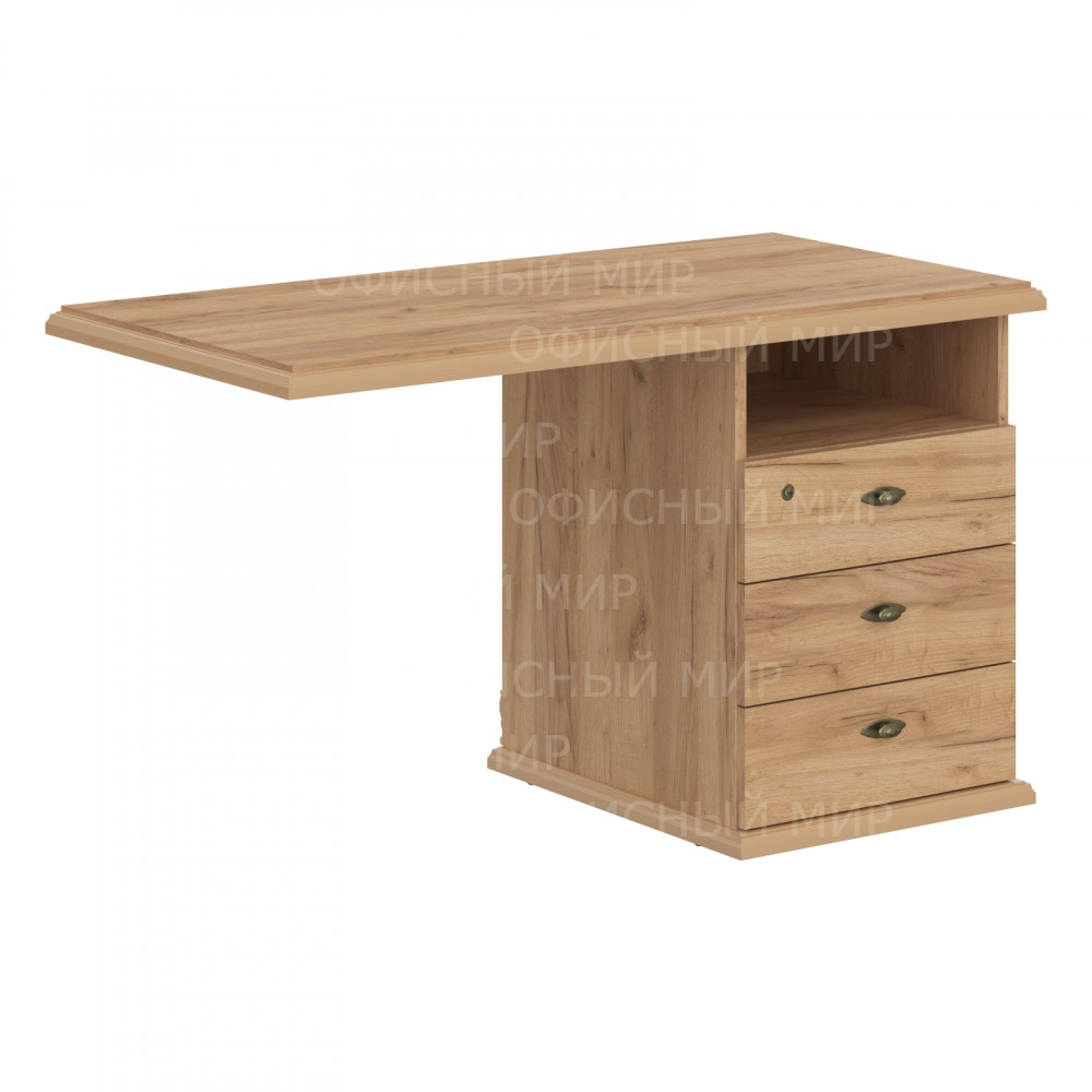 Универсальная приставная тумба RAUT для офисного или домашнего использования, размер - 1200х710х600 мм, цвет – Дуб Девон. Тумба имеет 3 ящика и одну открытую полочку. На каждом ящике установлена стильная металлическая ручка. Верх оснащен солидной столешницей из ЛДСП 18 мм с рамочным профилем из МДФ 30 мм (видимая толщина столешницы – 38 мм). Основание тумбы имеет эффектное расширение. Надежная защита всех элементов из ЛДСП – кромка ПВХ. Конструкция тумбы оснащена прочными силовыми креплениями – эксцентриковыми стяжками. Регулируемые по высоте опоры обеспечат тумбе устойчивость на неровном полу.