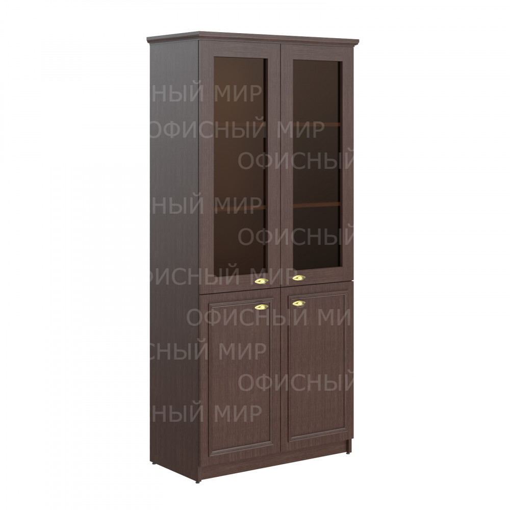 Широкий комбинированный шкаф RAUT для офисного или домашнего использования, размер - 922х2023х466 мм, цвет – Венге Магия. Двустворчатый шкаф оснащенный 5 полками, 2 нижние закрываются дверцами из ЛДСП под цвет конструкции, три верхние – стеклянными дверцами. На всех дверцах установлены стильные металлические ручки. Верх оснащен солидным топом из ЛДСП 18 мм с рамочным профилем из МДФ 30 мм. Фасады обрамлены декоративными накладками из МДФ. Надежная защита всех элементов из ЛДСП – кромка ПВХ. Конструкция шкафа оснащена прочными силовыми креплениями – эксцентриковыми стяжками. Регулируемые по высоте опоры обеспечат устойчивость на неровном полу.