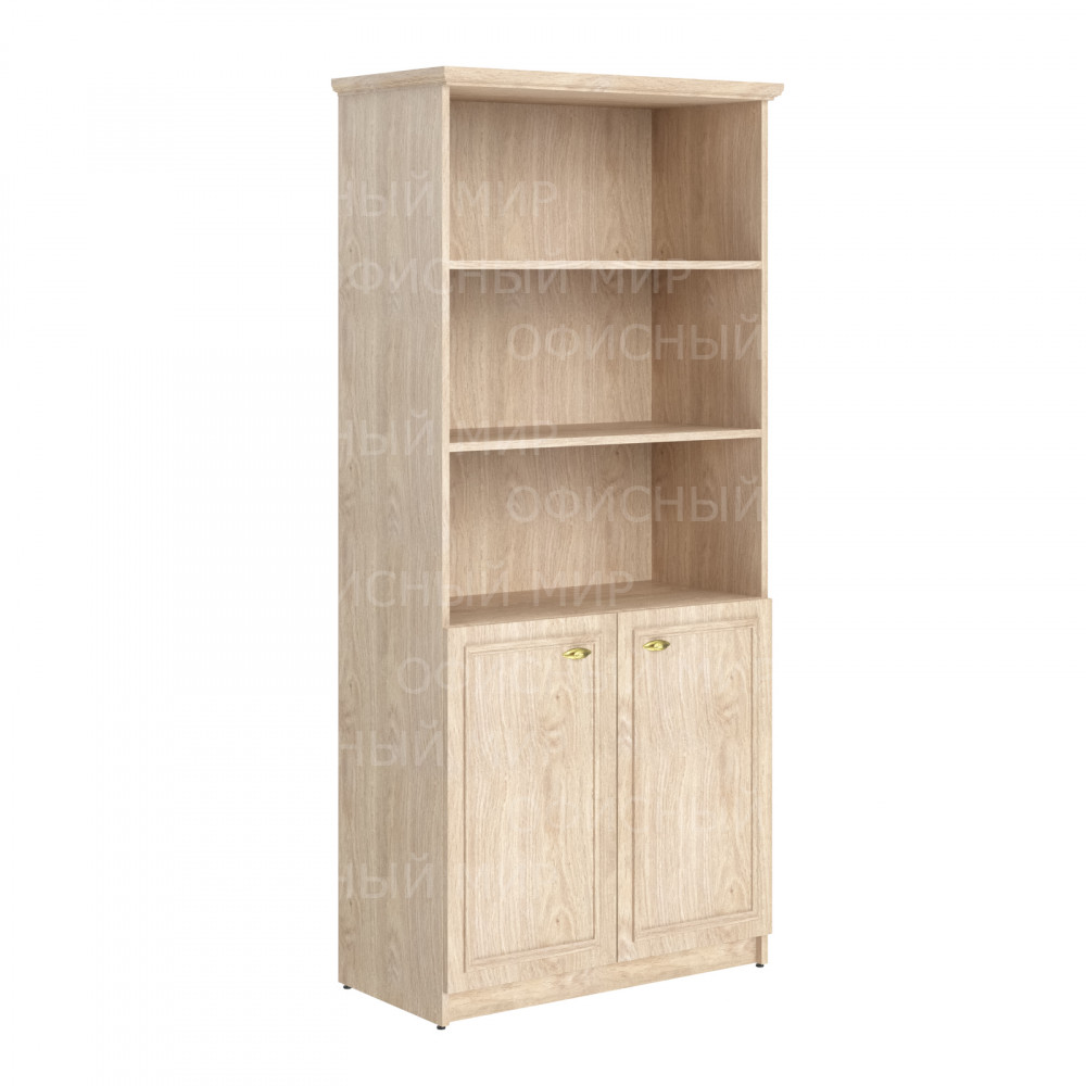 Широкий шкаф-стеллаж RAUT для офисного или домашнего использования, размер - 922х2023х466 мм, цвет – Дуб Девон. Шкаф оснащен 5 полками, 2 нижние закрываются дверцами из ЛДСП под цвет конструкции, три верхние – открытые. На дверцах установлены стильные металлические ручки. Верх оснащен солидным топом из ЛДСП 18 мм с рамочным профилем из МДФ 30 мм. Фасады обрамлены декоративными накладками из МДФ. Надежная защита всех элементов из ЛДСП – кромка ПВХ. Конструкция шкафа оснащена прочными силовыми креплениями – эксцентриковыми стяжками. Регулируемые по высоте опоры обеспечат устойчивость на неровном полу.