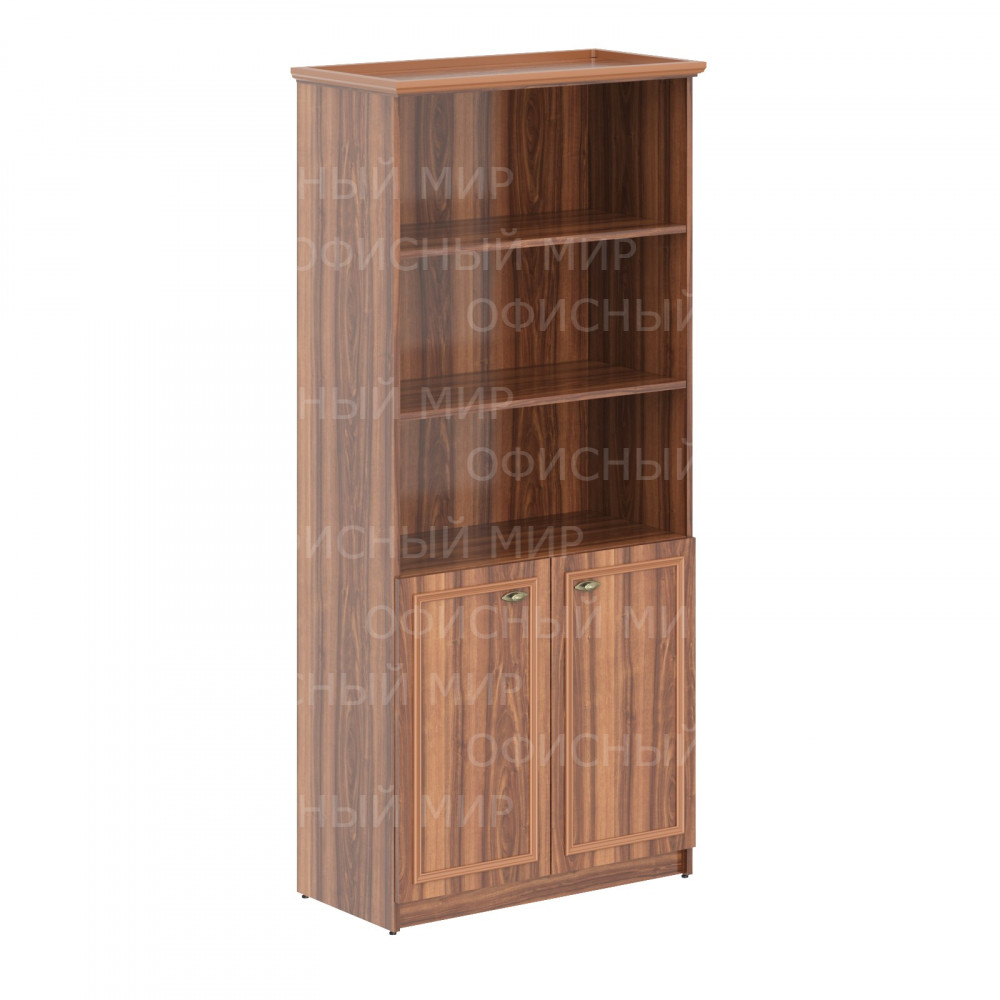 Широкий шкаф-стеллаж RAUT для офисного или домашнего использования, размер - 922х2023х466 мм, цвет – Орех Даллас. Шкаф оснащен 5 полками, 2 нижние закрываются дверцами из ЛДСП под цвет конструкции, три верхние – открытые. На дверцах установлены стильные металлические ручки. Верх оснащен солидным топом из ЛДСП 18 мм с рамочным профилем из МДФ 30 мм. Фасады обрамлены декоративными накладками из МДФ. Надежная защита всех элементов из ЛДСП – кромка ПВХ. Конструкция шкафа оснащена прочными силовыми креплениями – эксцентриковыми стяжками. Регулируемые по высоте опоры обеспечат устойчивость на неровном полу.