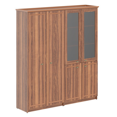 Большой комбинированный шкаф с гардеробом RAUT для офисного или домашнего использования, размер - 1808х2023х466 мм, цвет – Орех Даллас. Двустворчатый шкаф оснащенный 5 полками, 2 нижние закрываются дверцами из ЛДСП под цвет конструкции, три верхние – стеклянными дверцами. Гардероб оснащен 2 выдвижными штангами и 2 полочками, которые расположены сверху и снизу. На всех дверцах установлены стильные металлические ручки. Верх оснащен солидным топом из ЛДСП 18 мм с рамочным профилем из МДФ 30 мм. Фасады обрамлены декоративными накладками из МДФ. Надежная защита всех элементов из ЛДСП – кромка ПВХ. Конструкция шкафа оснащена прочными силовыми креплениями – эксцентриковыми стяжками. Регулируемые по высоте опоры обеспечат устойчивость на неровном полу.