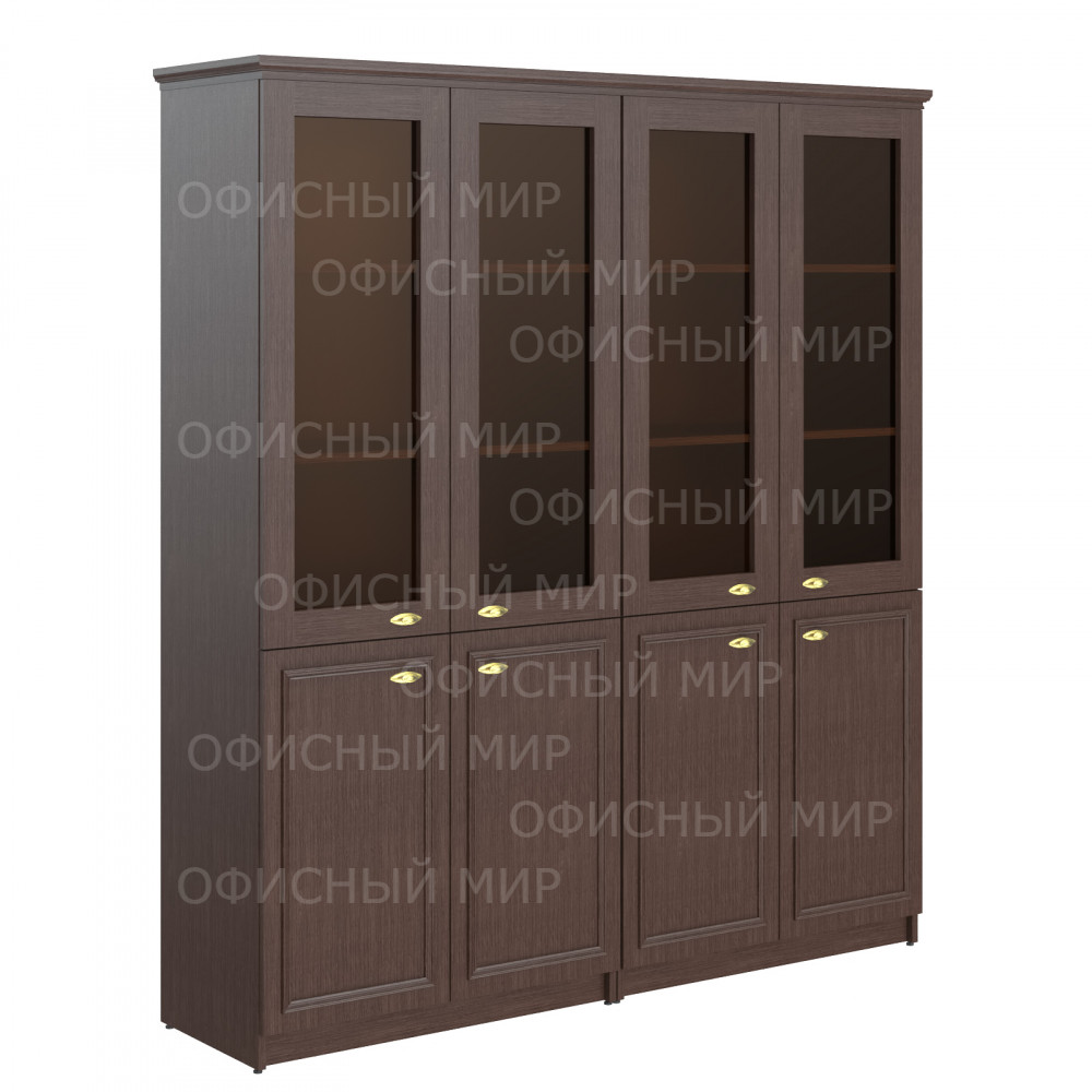 Большой комбинированный шкаф RAUT для офисного или домашнего использования, размер - 1808х2023х466 мм, цвет – Венге Магия. Двойной двустворчатый шкаф оснащенный 5 полками, 2 нижние закрываются дверцами из ЛДСП под цвет конструкции, три верхние – стеклянными дверцами. На всех дверцах установлены стильные металлические ручки. Верх оснащен солидным топом из ЛДСП 18 мм с рамочным профилем из МДФ 30 мм. Фасады обрамлены декоративными накладками из МДФ. Надежная защита всех элементов из ЛДСП – кромка ПВХ. Конструкция шкафа оснащена прочными силовыми креплениями – эксцентриковыми стяжками. Регулируемые по высоте опоры обеспечат устойчивость на неровном полу.