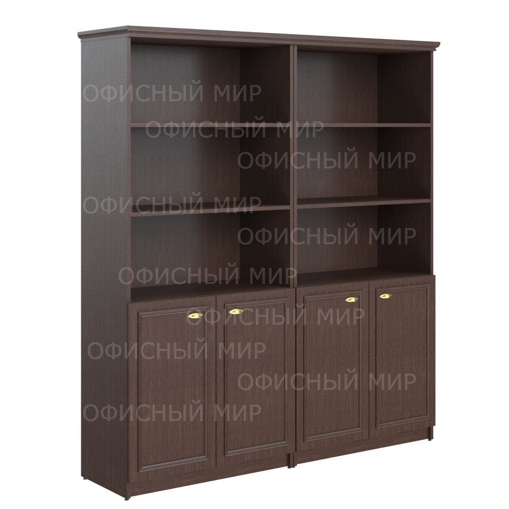 Большой шкаф-стеллаж RAUT для офисного или домашнего использования, размер - 1808х2023х466 мм, цвет – Венге Магия. Двойной шкаф оснащенный 5 полками, 2 нижние закрываются дверцами из ЛДСП под цвет конструкции, три верхние – открытые. На дверцах установлены стильные металлические ручки. Верх оснащен солидным топом из ЛДСП 18 мм с рамочным профилем из МДФ 30 мм. Фасады обрамлены декоративными накладками из МДФ. Надежная защита всех элементов из ЛДСП – кромка ПВХ. Конструкция шкафа оснащена прочными силовыми креплениями – эксцентриковыми стяжками. Регулируемые по высоте опоры обеспечат устойчивость на неровном полу.