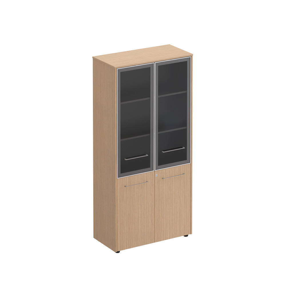 • Шкаф укомплектован двумя стеклянными дверями в металлической рамке без замка и двумя дверями из ЛДСтП с замком на правой двери