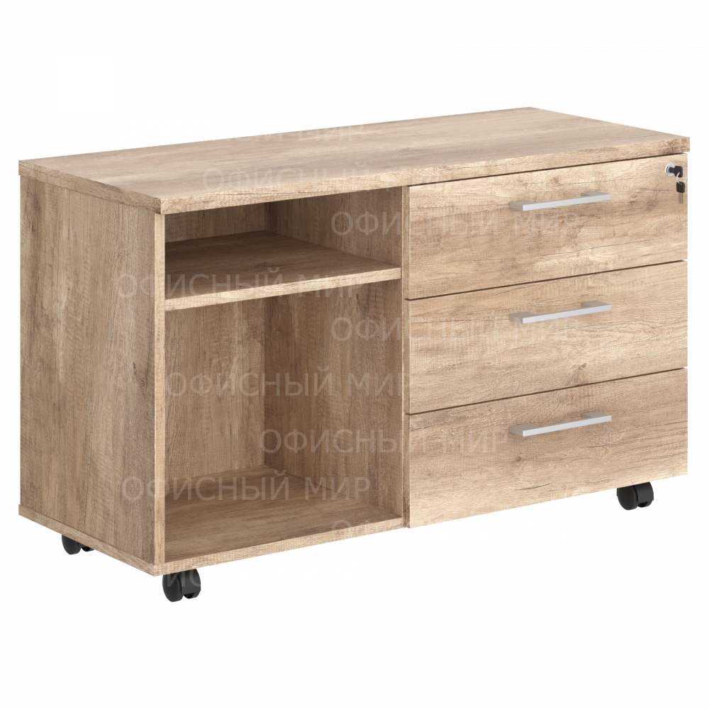 Солидная и большая приставная тумба TORR-Z для использования при оформлении современного кабинета в офисе или дома. Размеры - 1078х650х452 мм, цвет - Дуб Каньон. Тумба имеет солидный верхний топ 25 мм. Удобные колесики с плавным ходом, надежная защита торцевых поверхностей - кромка ПВХ 2 мм. Тумба имеет эффектный и современный дизайн, одна ее половина выполнена в виде ящиков, вторая – открытые полочки. Количество ящиков – 3, количество полочек - 2. Ящики тумбы оснащены центральным замком. Конструкция тумбы оснащена прочными силовыми креплениями – эксцентриковыми стяжками.