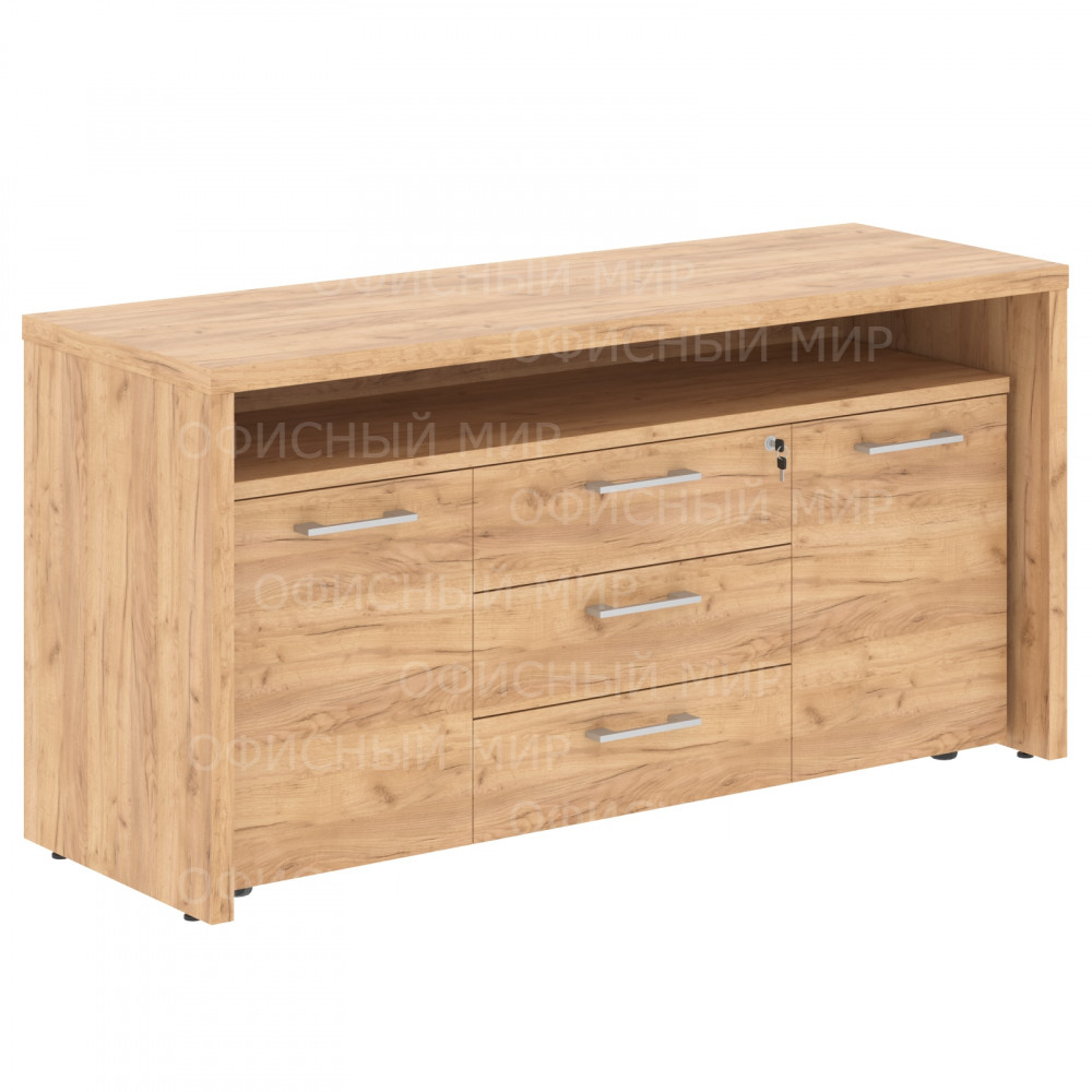 Современная тумба с фригобаром TORR-Z для офисного или домашнего использования, размер - 1640х800х550 мм, цвет – Дуб Девон. Данная модель выполнена в современном и эффектном дизайне, благодаря чему придаст кабинету более презентабельный вид. Тумба имеет солидный верхний топ 38 мм. Все торцевые поверхности элементов тумбы надежно защищены кромкой ПВХ 2 мм. Тумба оснащена 3 ящиками с центральным замком и двумя боковыми секциями предназначенными для фригобара. Конструкция тумбы оснащена прочными силовыми креплениями – эксцентриковыми стяжками. Регулируемые по высоте опоры обеспечат тумбе устойчивость на неровном полу.