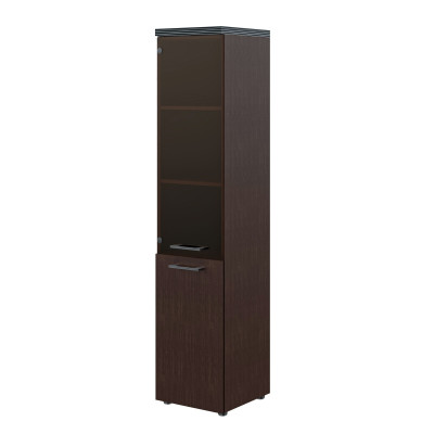 Универсальный и солидный комбинированный шкаф TORR для офисного или домашнего использования. Размеры - 432х1968х450 мм, тип - левосторонний, цвет - Венге Магия. Шкаф имеет солидный верхний топ 38 мм. Все торцевые поверхности основных элементов шкафа облицованы глянцевой акриловой пленкой 2 мм с декоративными полосками внутри кромки, что придает ей стильный 3D эффект. Торцы дополнительных элементов надежно защищены кромкой ПВХ 2 мм. Оснащен 5 полками, две нижние полки закрыты дверцей из ЛДСП, три верхние - стеклянной дверцей. На всех дверцах имеются долговечные и стильные металлические ручки. Конструкция шкафа оснащена прочными силовыми креплениями – эксцентриковыми стяжками. Регулируемые по высоте опоры обеспечат шкафу устойчивость на неровном полу.
