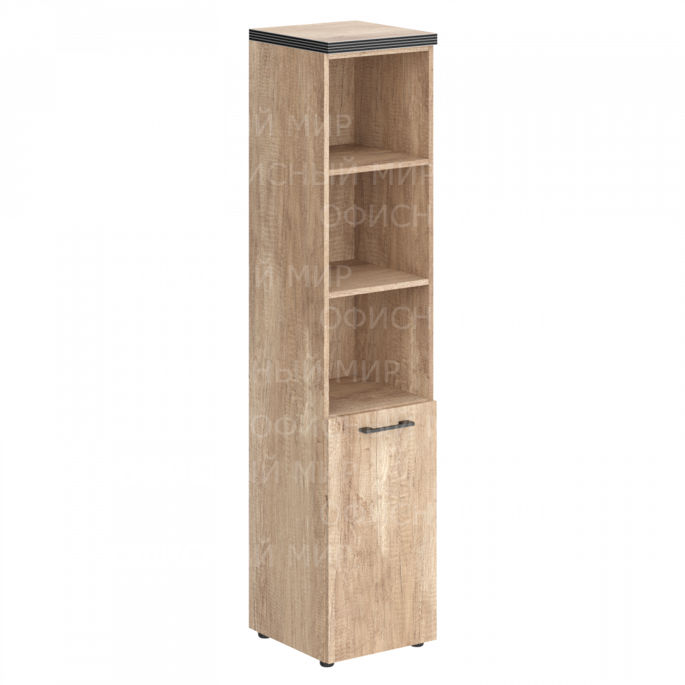 Универсальный шкаф-стеллаж TORR для офисного или домашнего использования. Размеры - 432х1968х450 мм, тип - левосторонний, цвет – Дуб Каньон. Шкаф имеет солидный верхний топ 38 мм. Все торцевые поверхности основных элементов шкафа облицованы глянцевой акриловой пленкой 2 мм с декоративными полосками внутри кромки, что придает ей стильный 3D эффект. Торцы дополнительных элементов надежно защищены кромкой ПВХ 2 мм. Оснащен 5 полками, две нижние полки закрыты дверцей из ЛДСП, три верхние – открыты. На дверце установлена долговечная и стильная металлическая ручка. Конструкция шкафа оснащена прочными силовыми креплениями – эксцентриковыми стяжками. Регулируемые по высоте опоры обеспечат шкафу устойчивость на неровном полу.