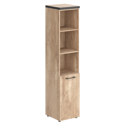 Универсальный шкаф-стеллаж TORR для офисного или домашнего использования. Размеры - 432х1968х450 мм, тип - правосторонний, цвет – Дуб Каньон. Шкаф имеет солидный верхний топ 38 мм. Все торцевые поверхности основных элементов шкафа облицованы глянцевой акриловой пленкой 2 мм с декоративными полосками внутри кромки, что придает ей стильный 3D эффект. Торцы дополнительных элементов надежно защищены кромкой ПВХ 2 мм. Оснащен 5 полками, две нижние полки закрыты дверцей из ЛДСП, три верхние – открыты. На дверце установлена долговечная и стильная металлическая ручка. Конструкция шкафа оснащена прочными силовыми креплениями – эксцентриковыми стяжками. Регулируемые по высоте опоры обеспечат шкафу устойчивость на неровном полу.