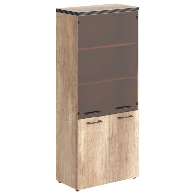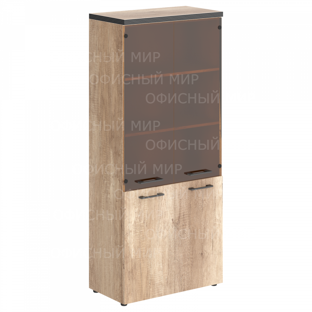 Солидный и широкий комбинированный шкаф TORR для офисного или домашнего использования. Размеры - 856х1968х450 мм, цвет - Дуб Каньон. Шкаф имеет солидный верхний топ 38 мм. Все торцевые поверхности основных элементов шкафа облицованы глянцевой акриловой пленкой 2 мм с декоративными полосками внутри кромки, что придает ей стильный 3D эффект. Торцы дополнительных элементов надежно защищены кромкой ПВХ 2 мм. Двустворчатый шкаф оснащенный 5 просторными полками, две нижние полки закрыты дверцами из ЛДСП, три верхние – стеклянными дверцами. На всех дверцах имеются долговечные и стильные металлические ручки. Конструкция шкафа оснащена прочными силовыми креплениями – эксцентриковыми стяжками. Регулируемые по высоте опоры обеспечат шкафу устойчивость на неровном полу.