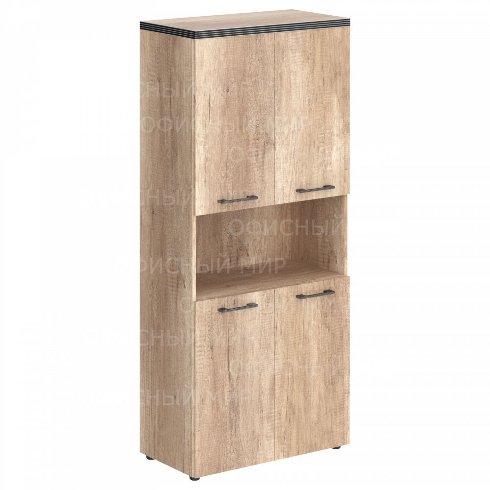 Широкий и высокий шкаф TORR для офисного или домашнего использования. Размеры - 856х1968х450 мм, цвет – Дуб Каньон. Шкаф имеет солидный верхний топ 38 мм. Все торцевые поверхности основных элементов шкафа облицованы глянцевой акриловой пленкой 2 мм с декоративными полосками внутри кромки, что придает ей стильный 3D эффект. Торцы дополнительных элементов надежно защищены кромкой ПВХ 2 мм. Двустворчатый шкаф оснащенный 5 просторными полками, 2 нижние и 2 верхние отдельно закрываются дверцами из ЛДСП, а посередине открытая ниша. На всех дверцах установлены стильные металлические ручки. Конструкция шкафа оснащена прочными силовыми креплениями – эксцентриковыми стяжками. Регулируемые по высоте опоры обеспечат шкафу устойчивость на неровном полу.