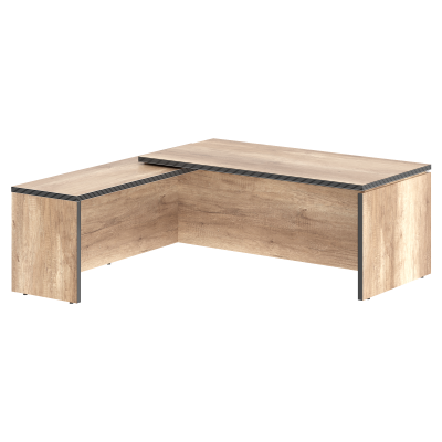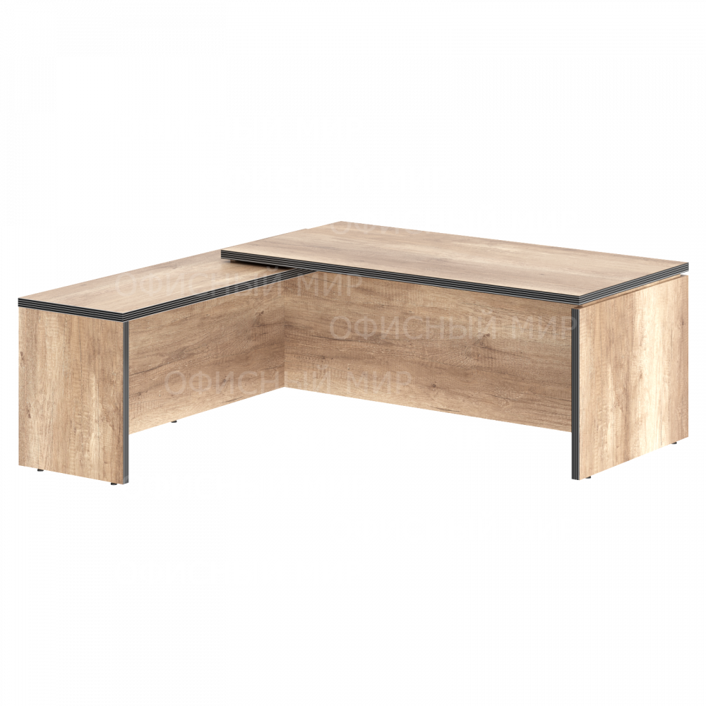 Большой угловой рабочий стол руководителя TORR для офисного или домашнего использования, размер - 2000х2000х750 мм, тип - левосторонний, цвет – Дуб Каньон. Оснащен надежными и долговечными опорами увеличенной ширины из ЛДСП 38 мм, которые расположены по краям стола. Между столешницей и опорами установлены специальные проставки, что создает эффект «парящей столешницы». Солидная и прочная столешница 38 мм. Все торцевые поверхности основных элементов стола облицованы глянцевой акриловой кромкой 2 мм с декоративными полосками внутри кромки, что придает ей 3D эффект. Торцы дополнительных элементов надежно защищены кромкой ПВХ 2 мм. Конструкция стола оснащена прочными силовыми креплениями – эксцентриковыми стяжками. Регулируемые по высоте опоры обеспечат столу устойчивость на неровном полу.