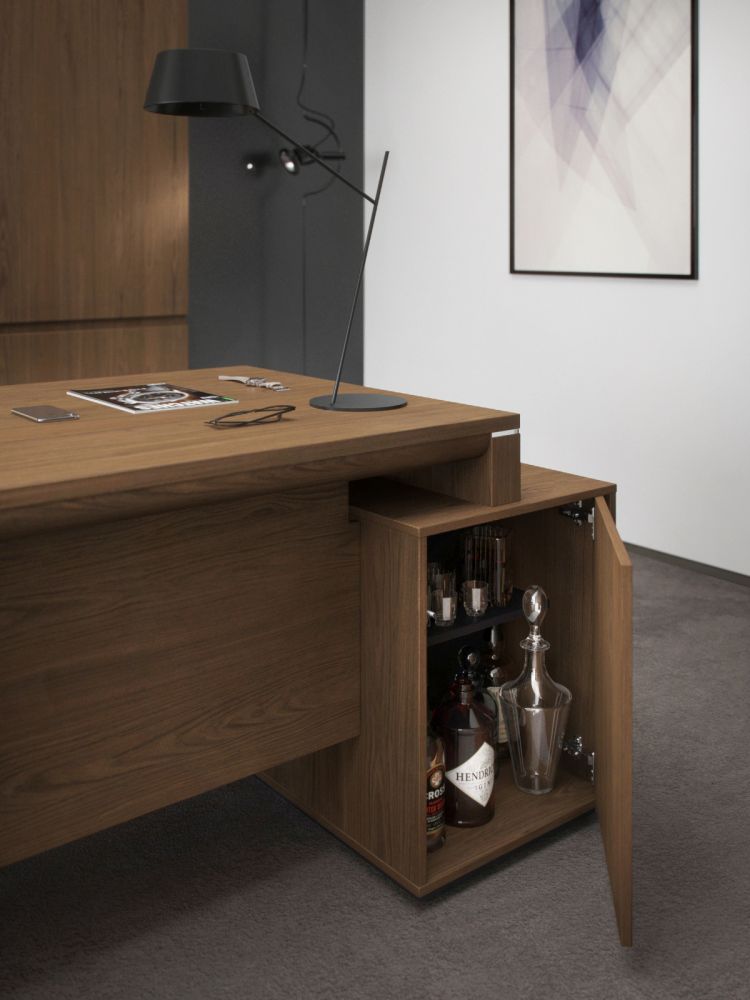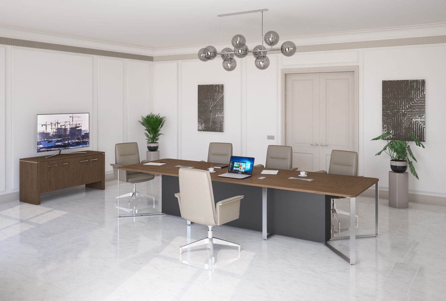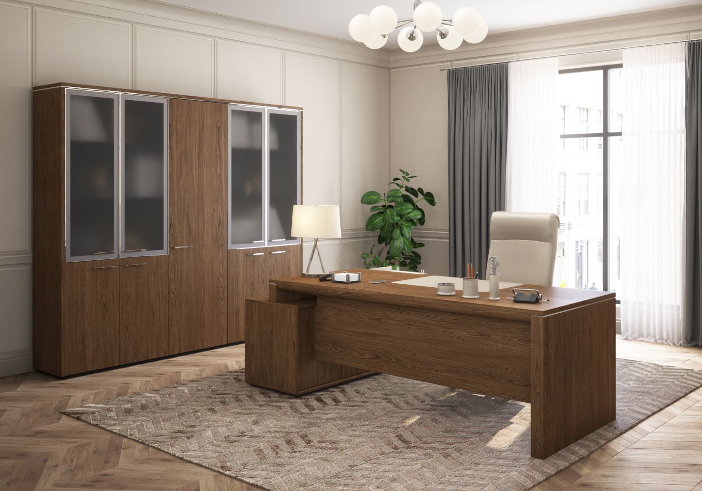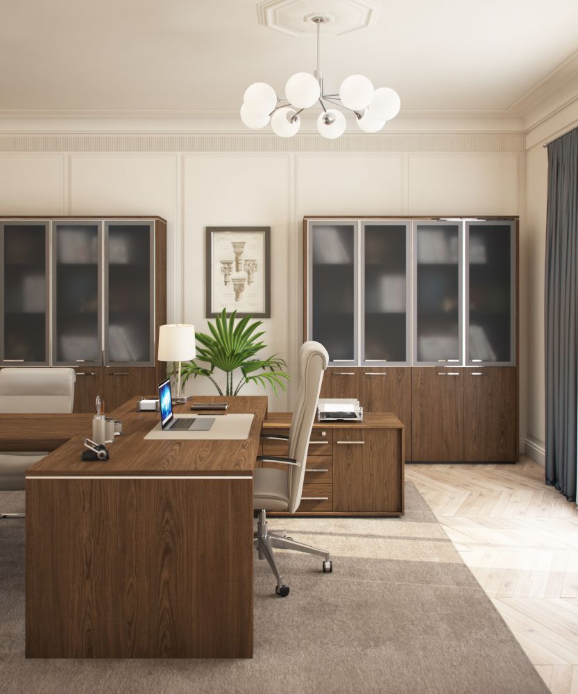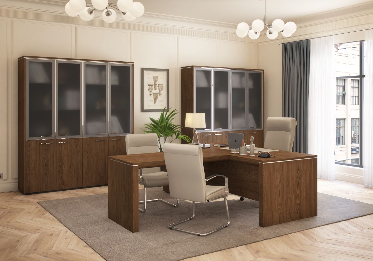 Особенности: столешницы рабочих и переговорных столов, брифинг - приставок имеют утолщения декоративными профилями из МДФ толщиной 50 мм, фанерованными шпоном дуба. Все декоративные вставки на столах, брифингах и топах шкафов имеют декоративное покрытие «хром глянец», также хромированные вставки имеются в столешницах переговорных столов. Лицевая металлическая фурнитура выполнена в декоре «хром глянец». Стеклянные алюминиевые рамочные фасады выполнены в глянцевом декоре в сочетании с матированным стеклом серого дымчатого оттенка. Тангенциальный рисунок шпона дуба в табачной тонировке максимально подчеркивает текстуру натурального материала. Декоративные боковые панели и топы шкафов (единые на группу из нескольких шкафов) также фанерованы шпоном дуба, что придает шкафной композиции законченный вид, а всему кабинету статусность и солидность.