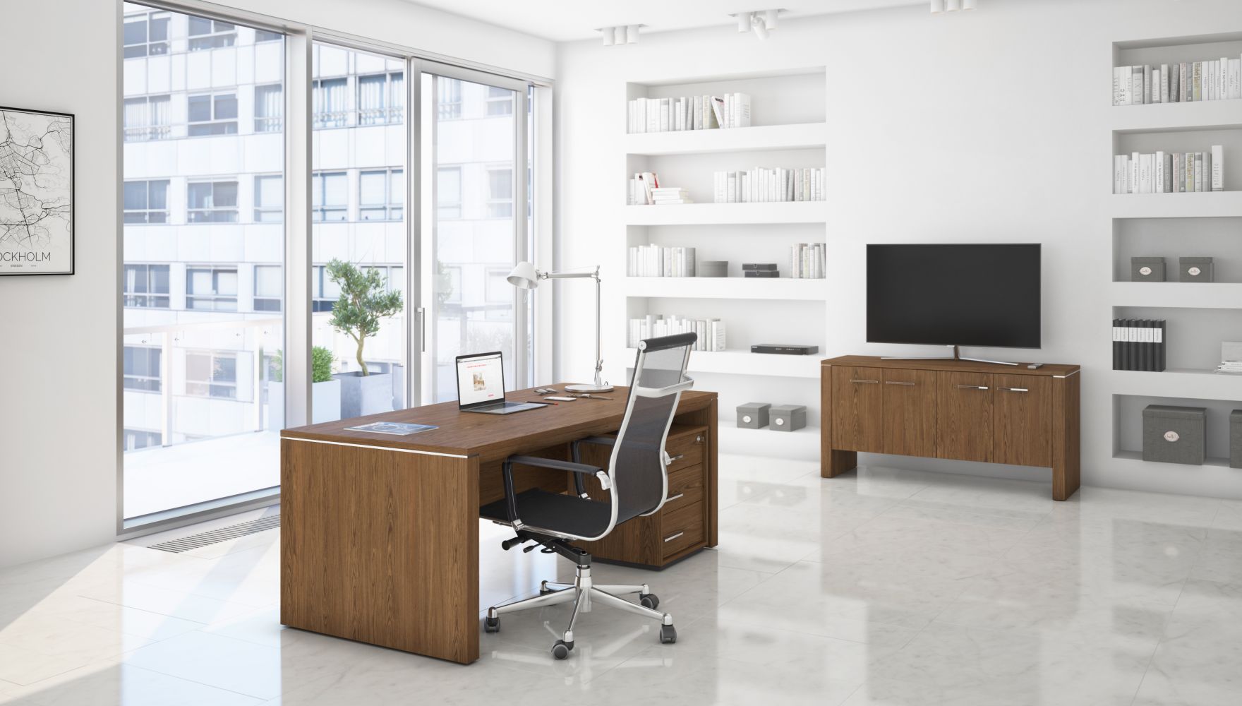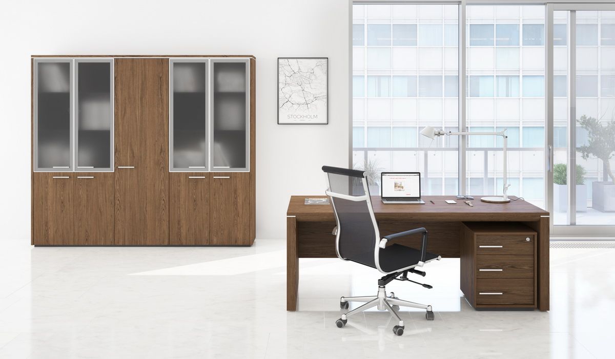 Толщина: столешниц столов для руководителей, брифинг-приставок – 75 мм, переговорных столов – 83 мм, переговорных столов на металлокаркасе - 26 мм, опор столов – 70 мм; топов шкафов – 33 мм, каркасов шкафов (за исключением полок), перегородок и полок тумб – 16 мм; каркасов тумб, фасадов – 17 мм; боковых декоративных панелей – 26 мм; полок шкафов – 25 мм.