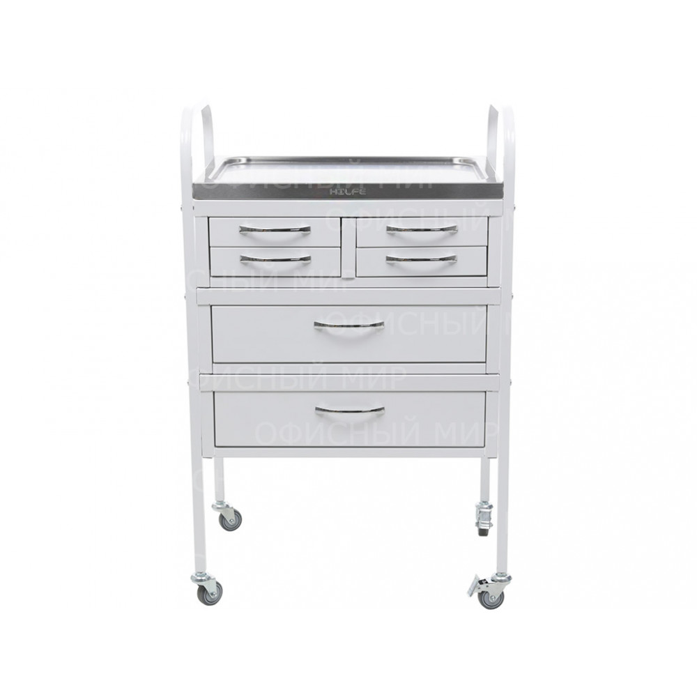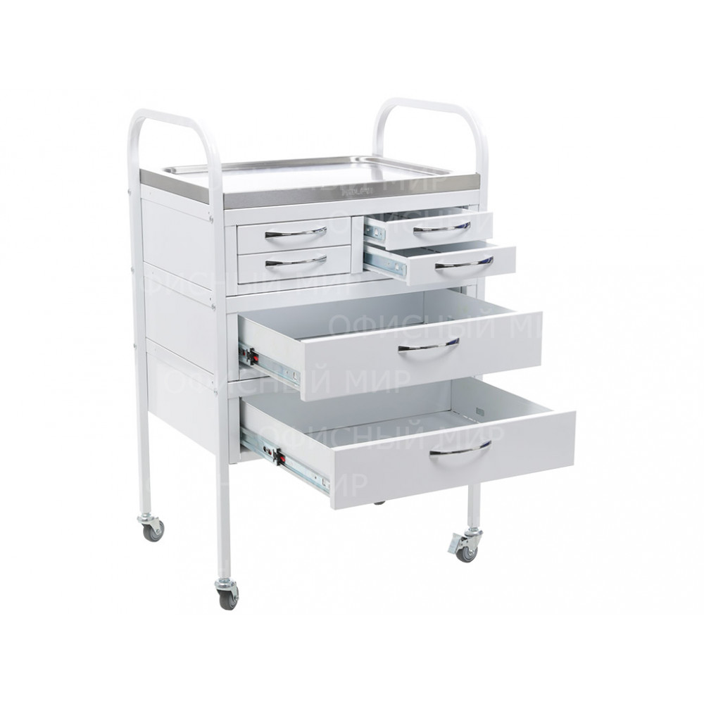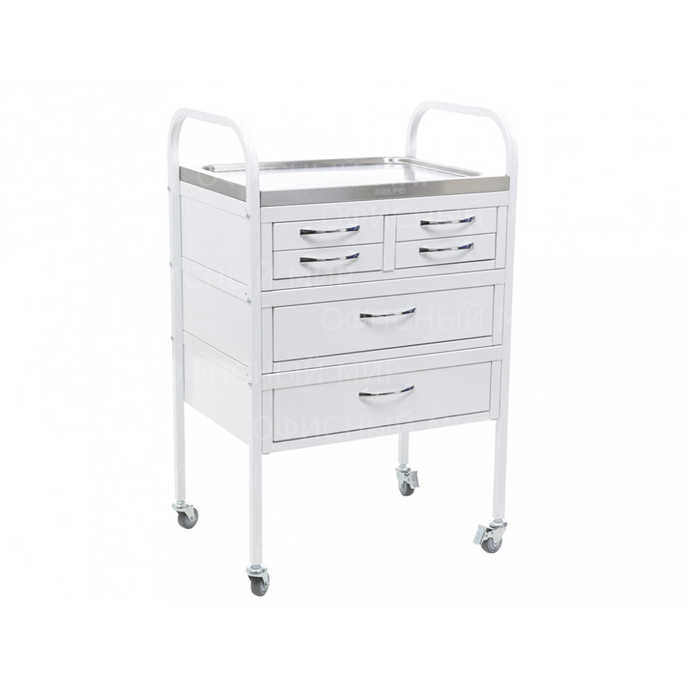 • столик процедурный имеет 4 колеса из немаркой резины, D=50 мм. Два колеса снабжены тормозом