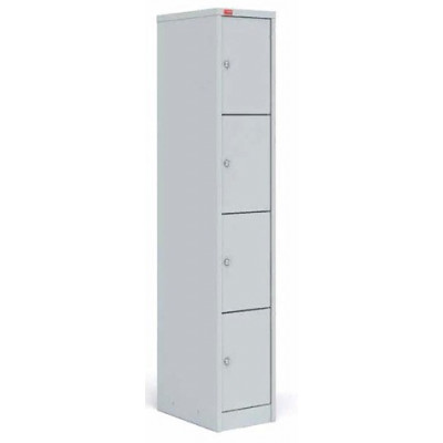 Односекционный металлический шкаф для сумок разборный, с четырьмя отделениями. Шкафы ШРМ-14 используются для хранения сумок, пакетов, а также сменной одежды. Каждое отделение оснащено врезным замком. Полимерное порошковое покрытие светло-серого цвета (RAL 7035).