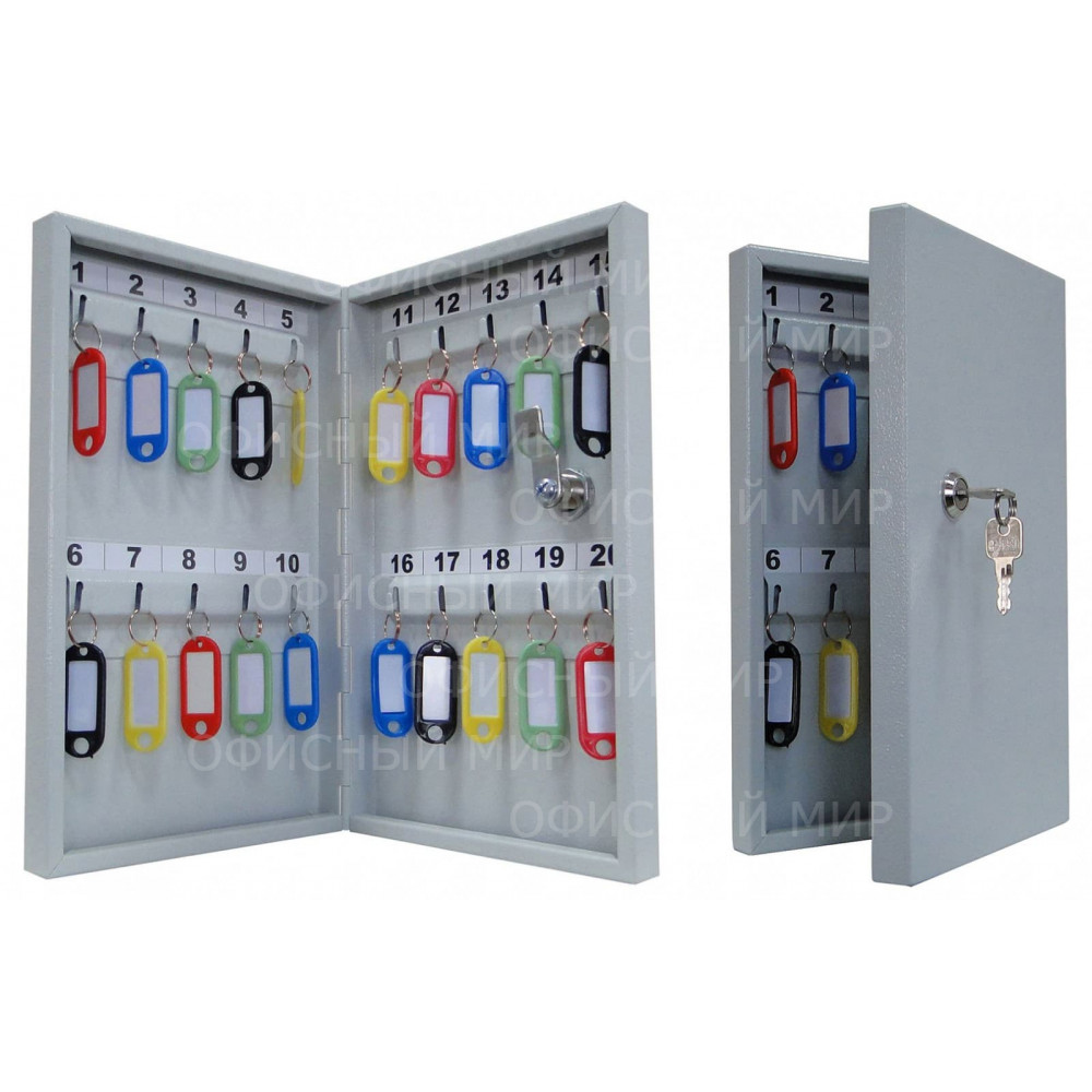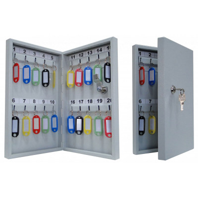 Шкаф металлический для хранения 20 ключей. Комплектуется брелками для ключей. В дверь установлен замок типа «Cam-Lock». Цвет: серый.