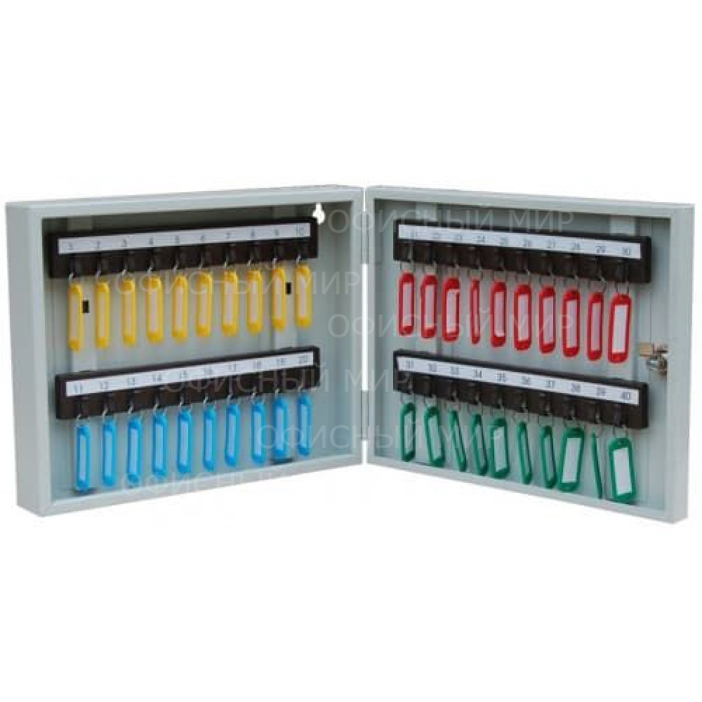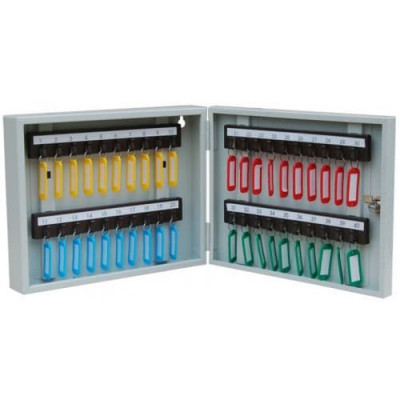 Шкаф металлический для хранения 40 ключей. Комплектуется брелками для ключей. В дверь установлен замок типа «Cam-Lock». Цвет: серый.