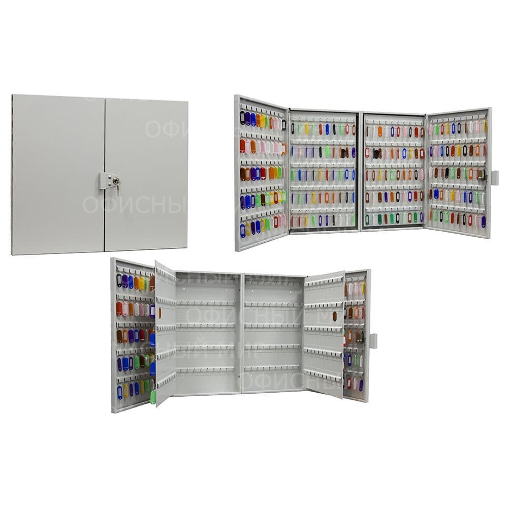 Шкаф металлический для хранения 400 ключей. Комплектуется брелками для ключей. В дверь установлен замок типа «Cam-Lock». Цвет: серый.