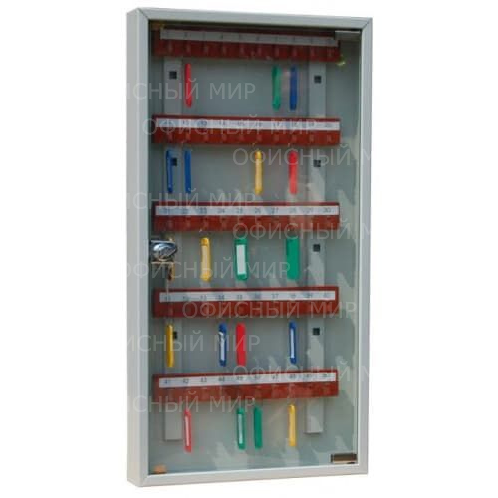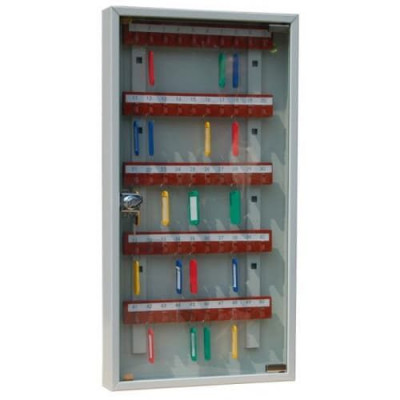 Шкаф металлический для хранения 50 ключей. Лицевая панель — стекло. Комплектуется брелками для ключей. В дверь установлен замок типа «Cam-Lock». Цвет: серый.