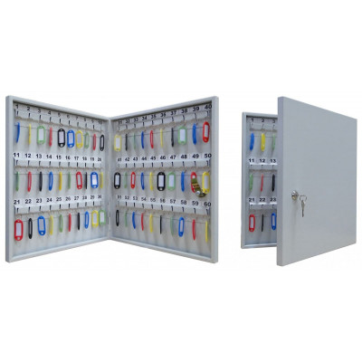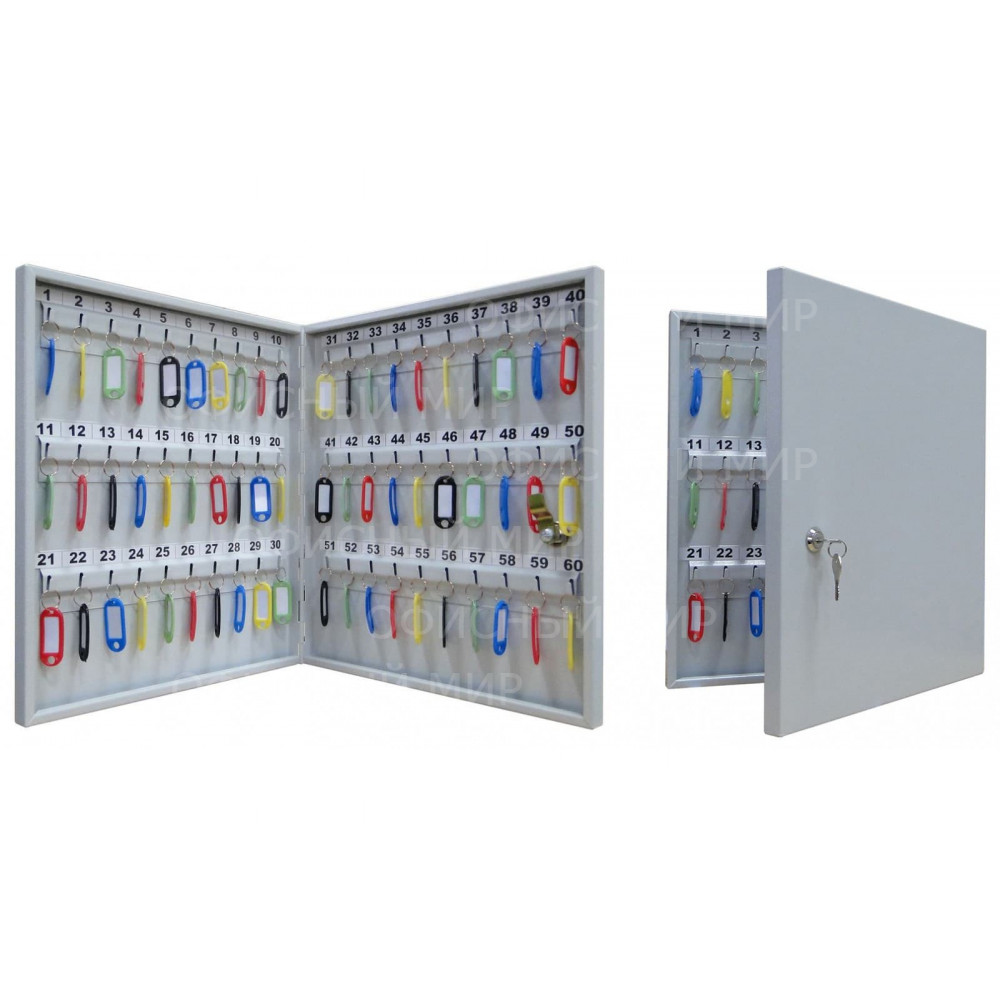 Шкаф металлический для хранения 60 ключей. Комплектуется брелками для ключей. В дверь установлен замок типа «Cam-Lock». Цвет: серый.