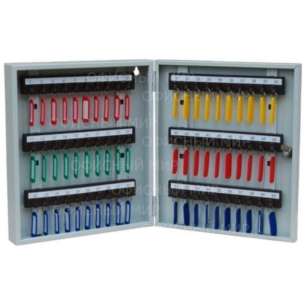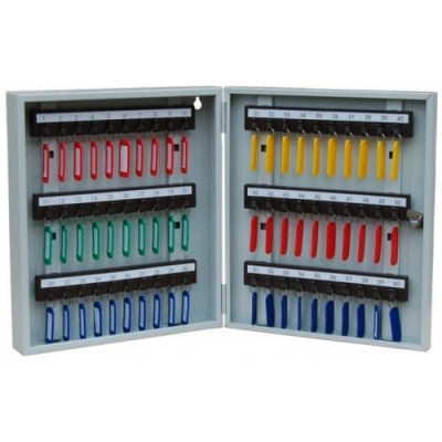 Шкаф металлический для хранения 60 ключей. Комплектуется брелками для ключей. В дверь установлен замок типа «Cam-Lock». Цвет: серый.