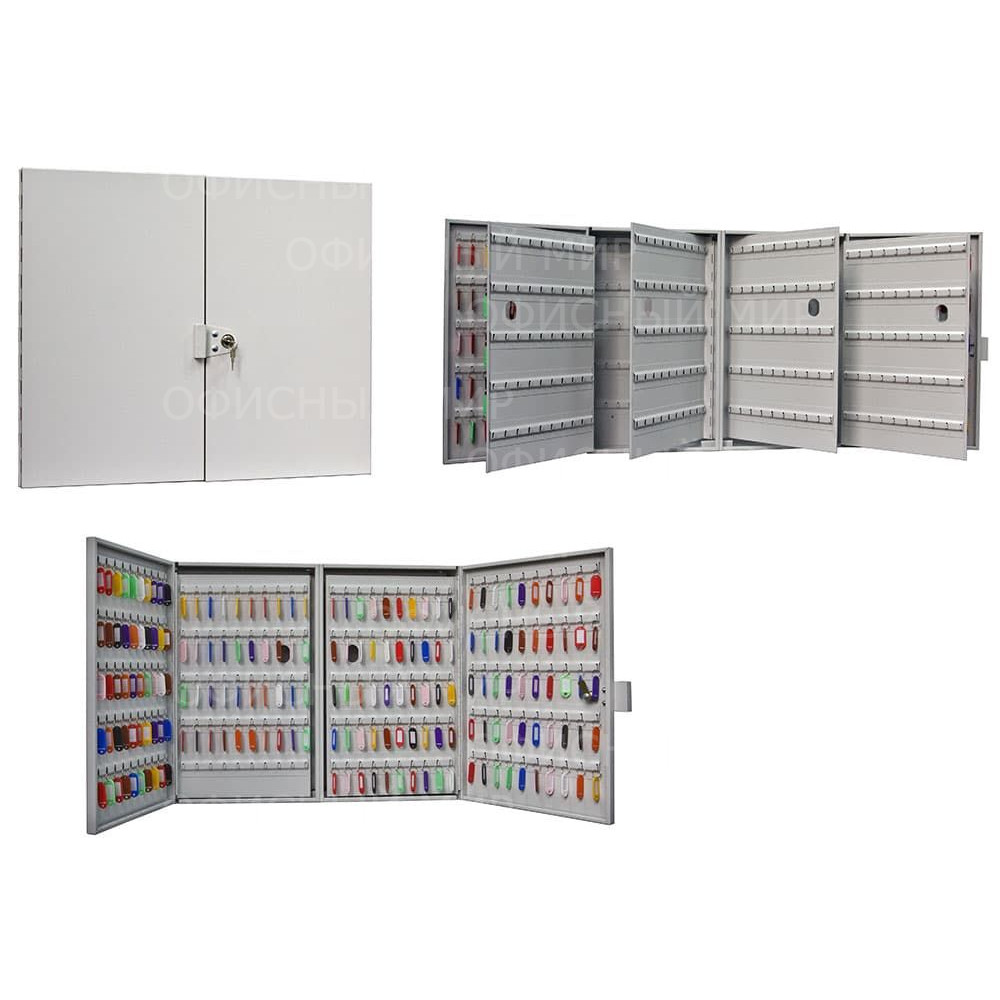 Шкаф металлический для хранения 600 ключей. Комплектуется брелками для ключей. В дверь установлен замок типа «Cam-Lock». Цвет: серый.