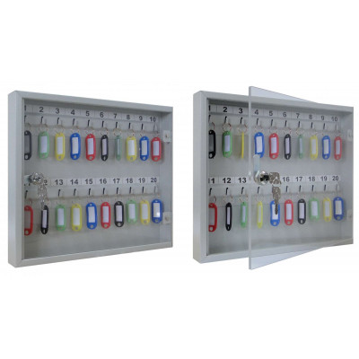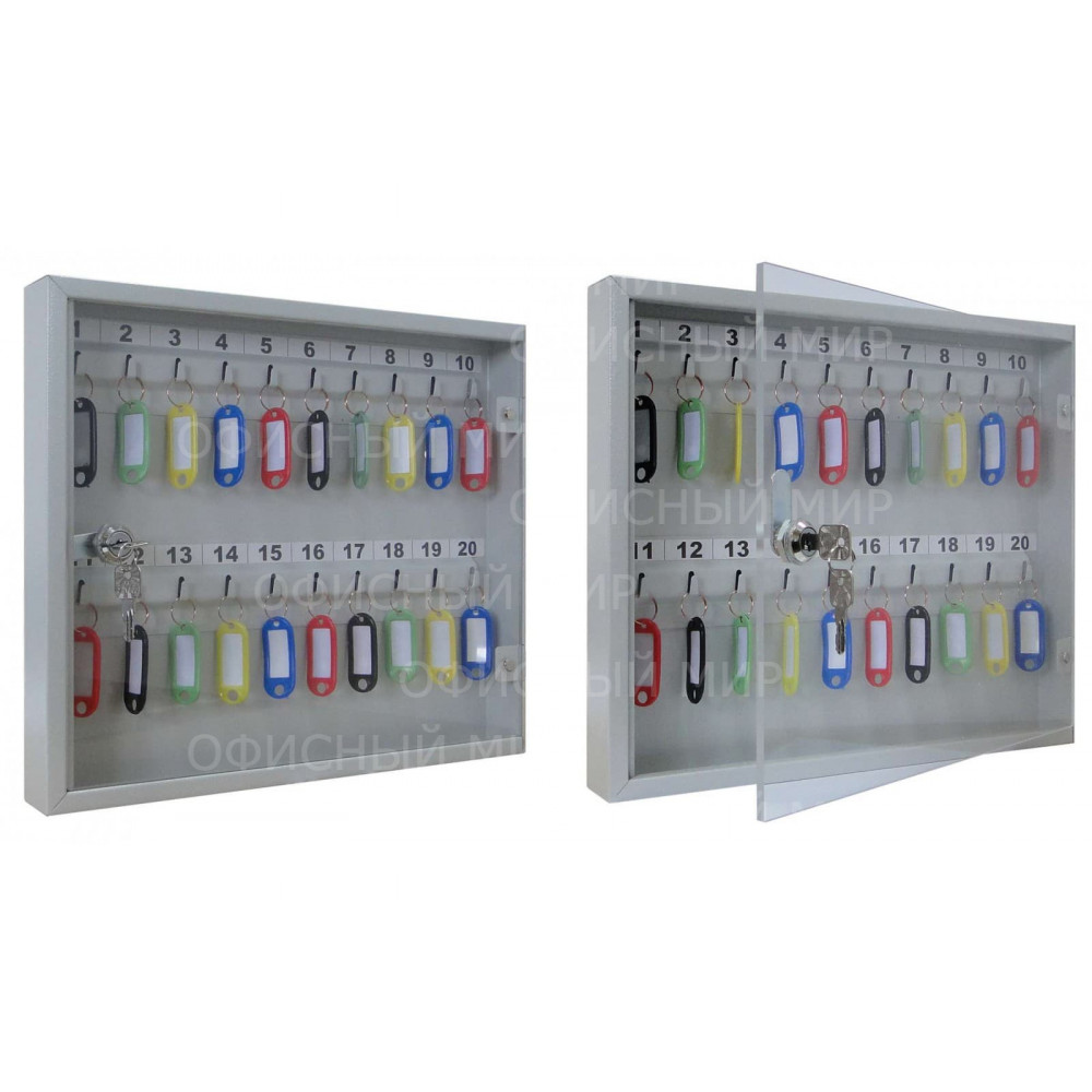 Шкаф металлический для хранения 20 ключей. Комплектуется брелками для ключей. В дверь установлен замок типа «Cam-Lock». Цвет: серый. Дверка шкафа из оргстекла, небьющаяся. Ключницы используются в любых помещениях для хранения ключей от различных видов замков и дверей в гостиницах, офисах, на проходных, контрольно-пропускных пунктах и в других помещениях.