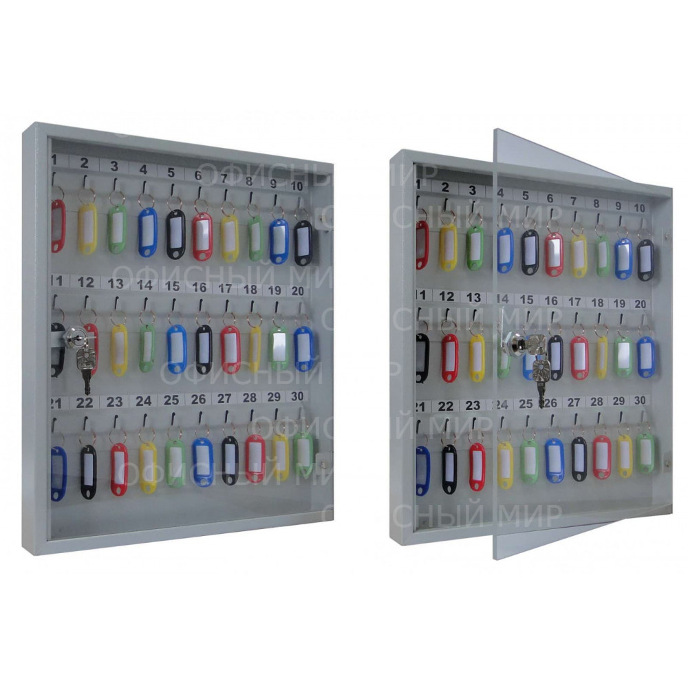 Шкаф металлический для хранения 30 ключей. Комплектуется брелками для ключей. В дверь установлен замок типа «Cam-Lock». Цвет: серый. Дверка шкафа из оргстекла, небьющаяся. Ключницы используются в любых помещениях для хранения ключей от различных видов замков и дверей в гостиницах, офисах, на проходных, контрольно-пропускных пунктах и в других помещениях.