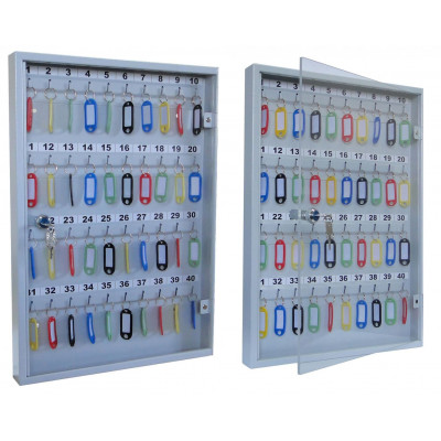 Шкаф металлический для хранения 40 ключей. Комплектуется брелками для ключей. В дверь установлен замок типа «Cam-Lock». Цвет: серый. Дверка шкафа из оргстекла, небьющаяся. Ключницы используются в любых помещениях для хранения ключей от различных видов замков и дверей в гостиницах, офисах, на проходных, контрольно-пропускных пунктах и в других помещениях.