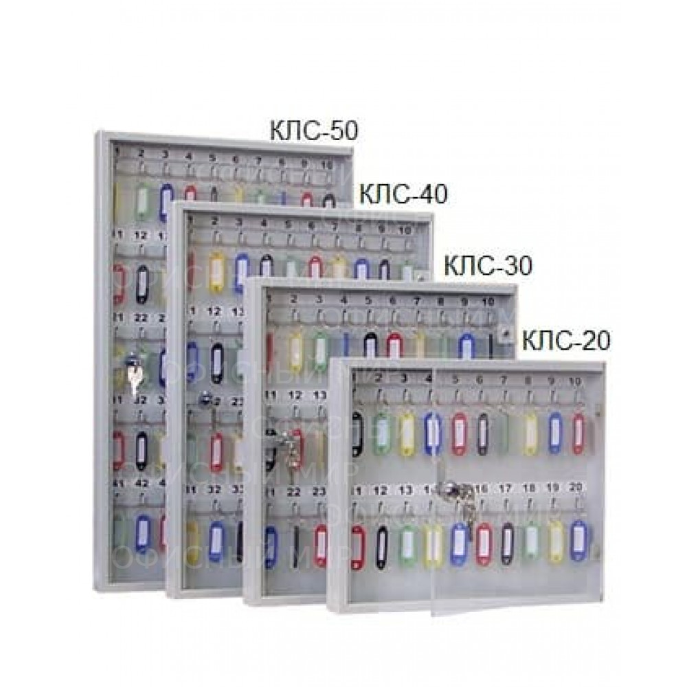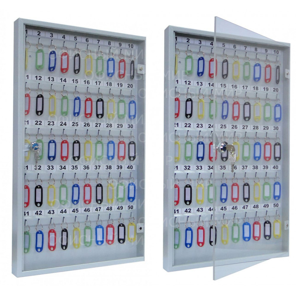 Шкаф металлический для хранения 50 ключей. Комплектуется брелками для ключей. В дверь установлен замок типа «Cam-Lock». Цвет: серый. Дверка шкафа из оргстекла, небьющаяся.