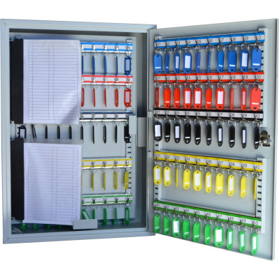 Шкаф металлический для хранения 150 ключей. Комплектуется замком. На задней стенке отверстия для крепления к стене, крепеж поставляется в комплекте с ключницей.
