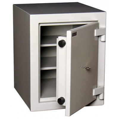 Внутри сейфа «КЗ 054» располагаются 2 съемные полки. В дне сейфа предусмотрено отверстие Ø11 мм для возможности анкерного крепления его к полу. Запирание сейфа осуществляется за счет ключевого сейфового замка класса «А» с ригельной системой — 2 активных ригеля Ø28 мм в сторону и пассивный П-образный ригель со стороны петель. Петли сейфа наружные, открывание двери – на 180°.