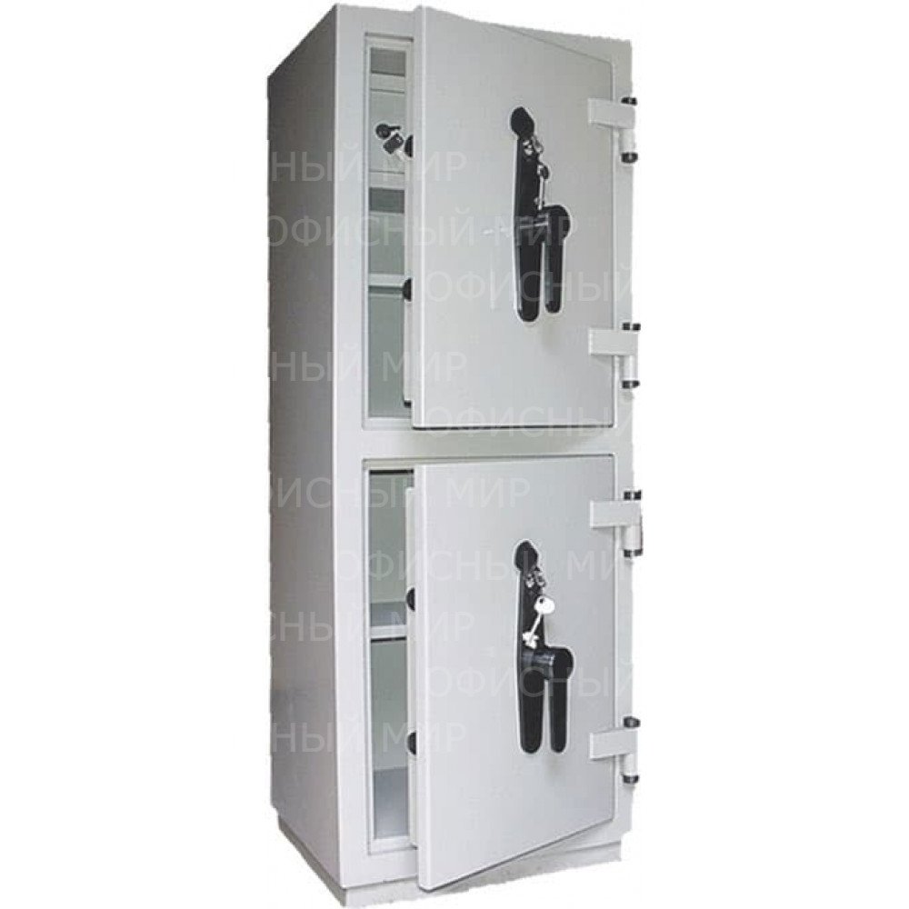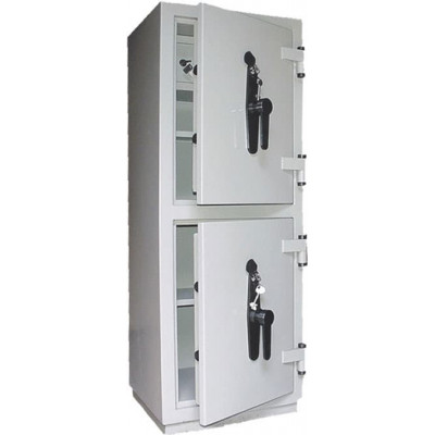 Сейф «КЗ 223т» имеет 2 независимых отделения, запираемых собственной дверью. В верхнем отделении располагается отсек ограниченного доступа (трейзер), запираемый на замок «почтового» типа и одна съемная полка, в нижнем – одна съемная полка. В дне сейфа предусмотрено отверстие Ø11 мм для возможности анкерного крепления его к полу. Каждая дверь сейфа оборудована запорным механизмомс 2-х сторонней ригельной системой запирания (по 2 ригеля Ø28 мм вправо/влево), который блокируется ключевым сейфовым замком класса «А» фирмы «CAWI» или «MAUER» производства Германии. Запорный механизм приводится в действие при помощи ручки. Чтобы открыть сейф необходимо: вставить ключ в замочную скважину, открыть замок и повернуть ручку на 90°. Закрывать в обратном порядке. Петли сейфа наружные, открывание двери – на 180°.
