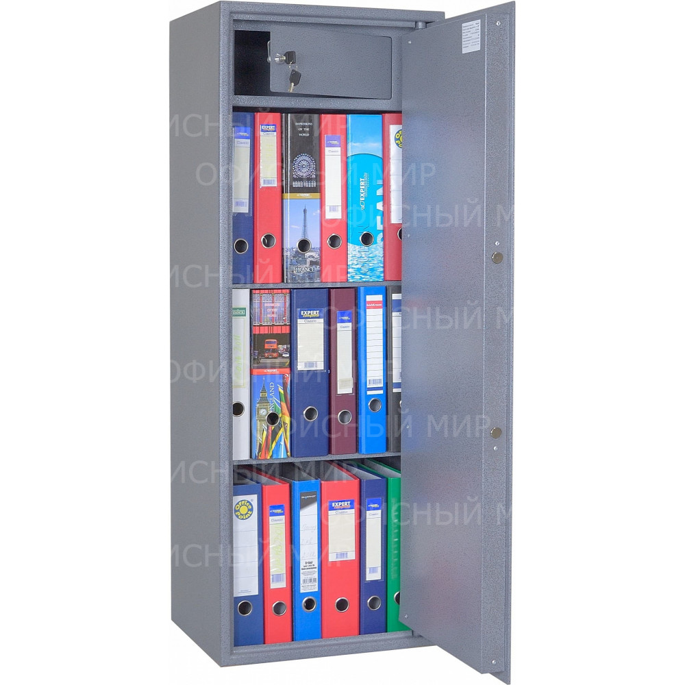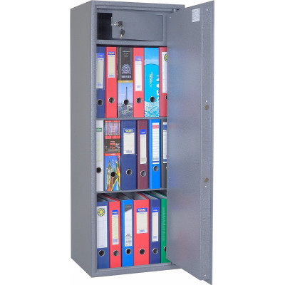 Сейф односекционный, оснащен двумя полками. В двери установлен ключевой 8-ми сувальдный замок с ригельной системой запирания. Диаметр ригеля 20 мм.