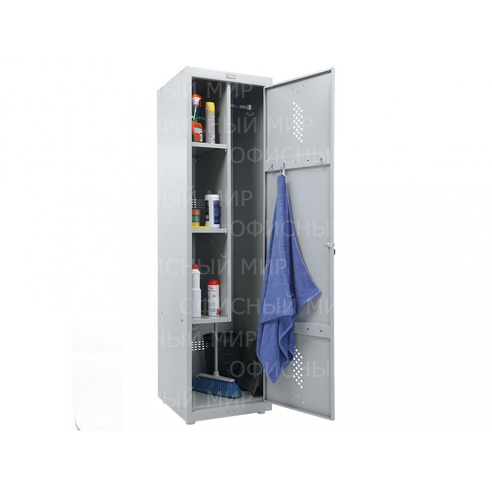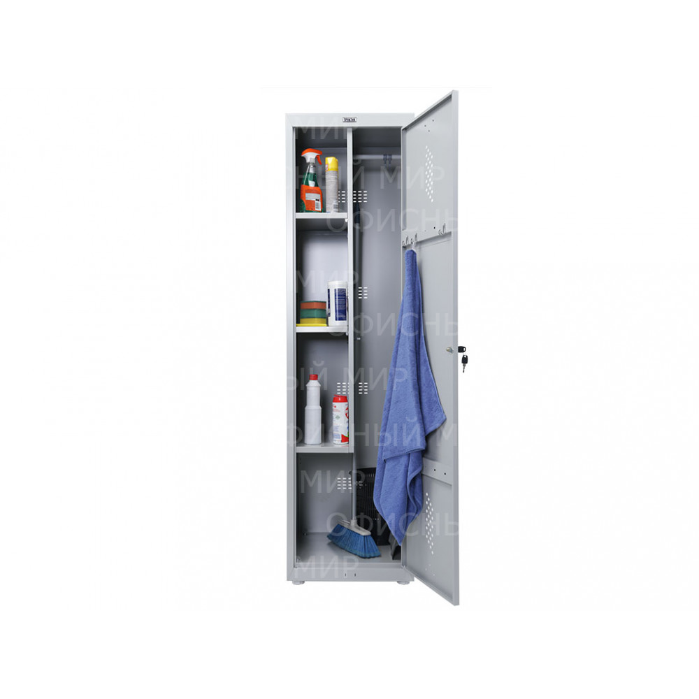 комплектация: вертикальная перегородка, 3 полки под хозяйственный инвентарь, держатель для швабры, крючки для одежды, перекладина для плечиков