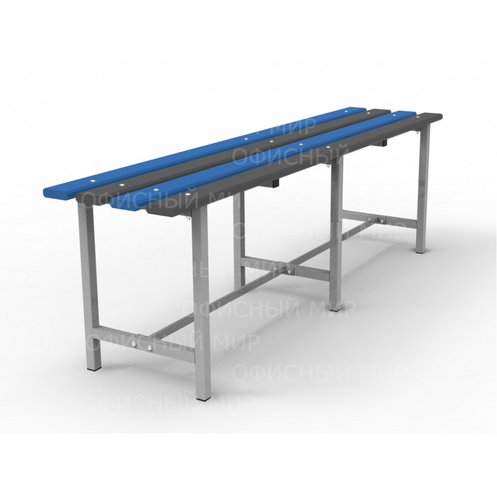 Скамья изготовлена на металлическом каркасе из трубы квадратного сечения 25х25, покрытым порошковой полимерной краской серого цвета. Сиденье изготовлено из пластикового настила, толщиной 20мм. Скамья предназначена для установки в раздевалках, спортивных школах и дошкольных учреждениях. Поставляется в разобранном виде в картонной упаковке