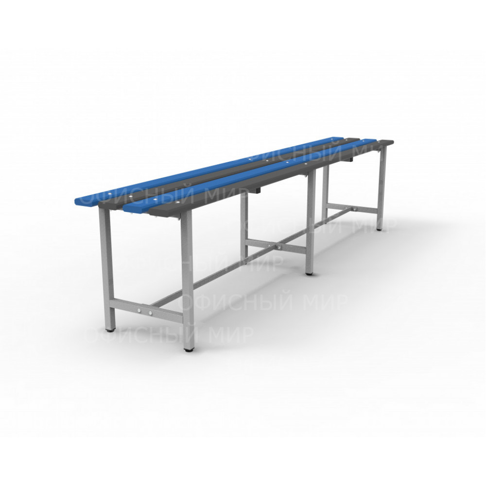 Скамья изготовлена на металлическом каркасе из трубы квадратного сечения 25х25, покрытым порошковой полимерной краской серого цвета. Сиденье изготовлено из пластикового настила, толщиной 20мм. Скамья предназначена для установки в раздевалках, спортивных школах и дошкольных учреждениях. Поставляется в разобранном виде в картонной упаковке