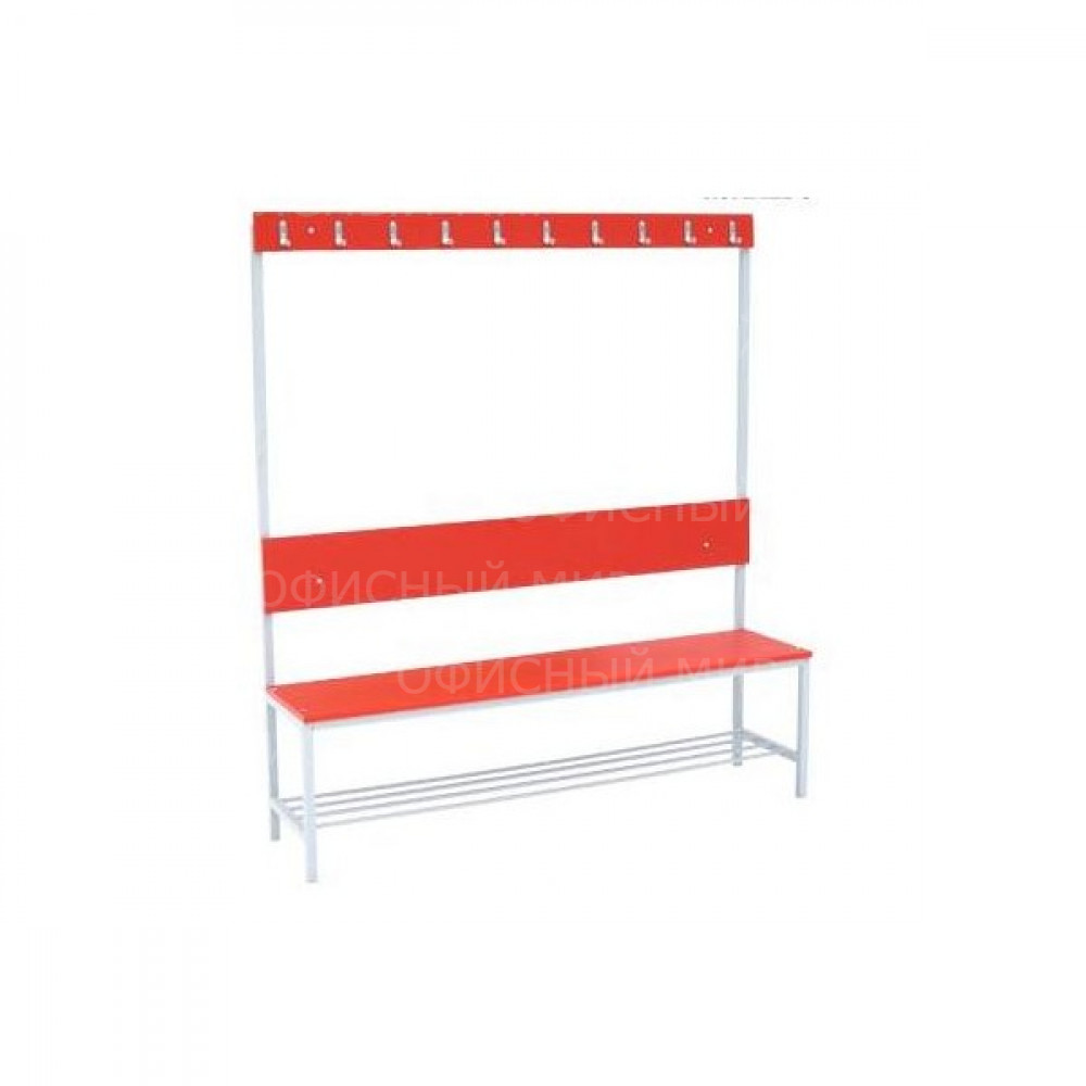 Предназначена для установки в спортивных раздевалках. 10 крючков для одежды. Специальная полочка под обувь. Материал скамьи – ЛДСП. Каркас выполнен из профильной трубы и окрашен порошковой краской. Цвет синий или красный.