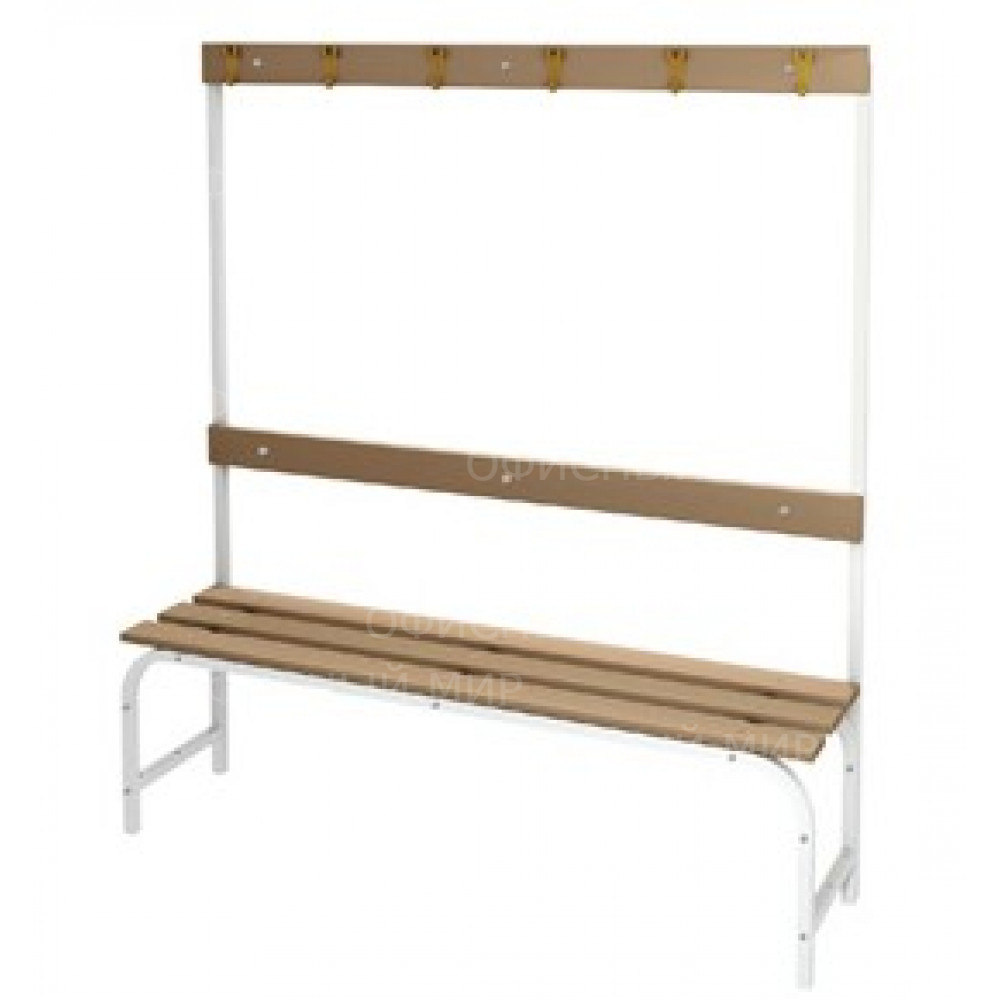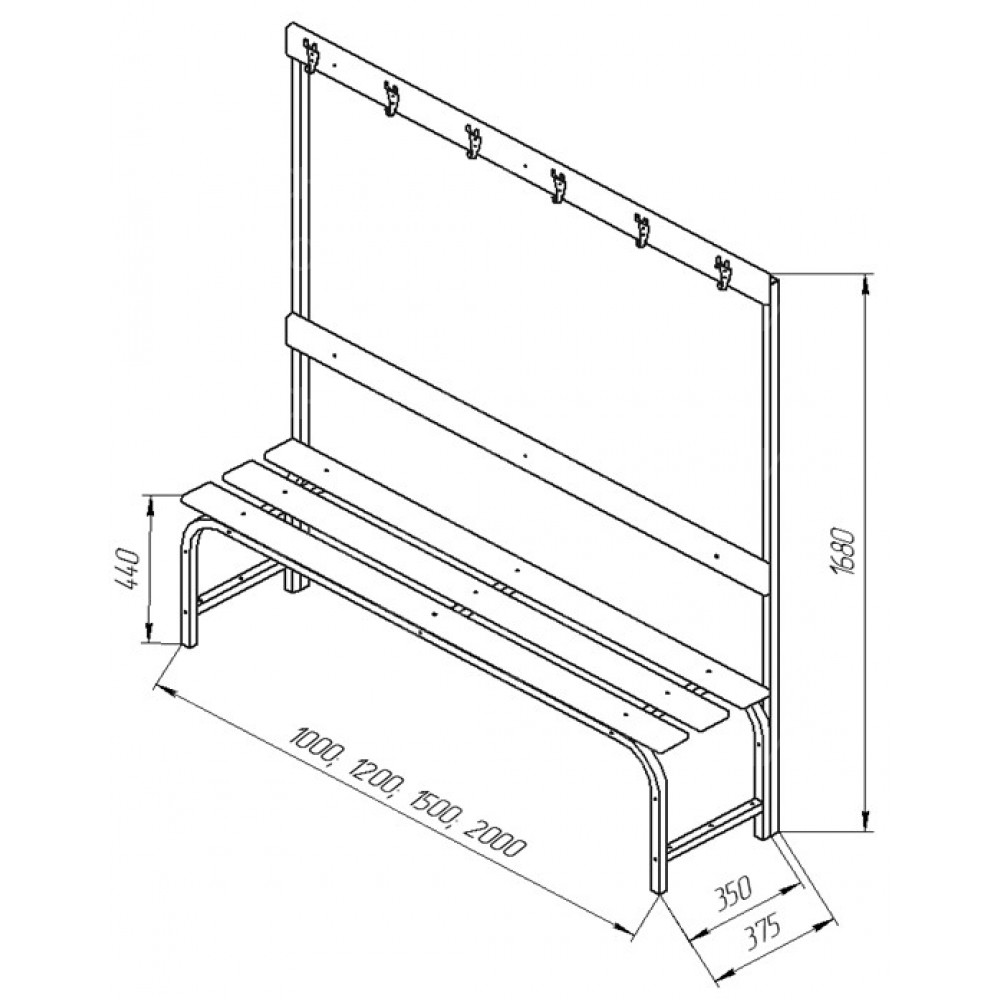 Скамья гардеробная СКВ со спинкой и вешалкой подходит для оборудования гардеробов, раздевалок в учебных и спортивных учреждениях, на производственных предприятиях любых отраслей. Чаще всего скамьи заказывают в дополнение к любым гардеробным шкафам. Сиденье и спинка изготовлены из обработанной древесины. Каркас и спинка скамейки изготовлен из профильной трубы и окрашен порошковой краской. В комплекте 6 крючков.