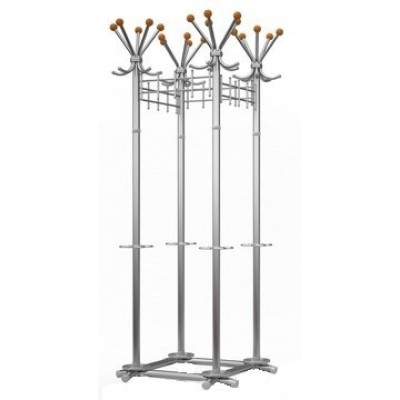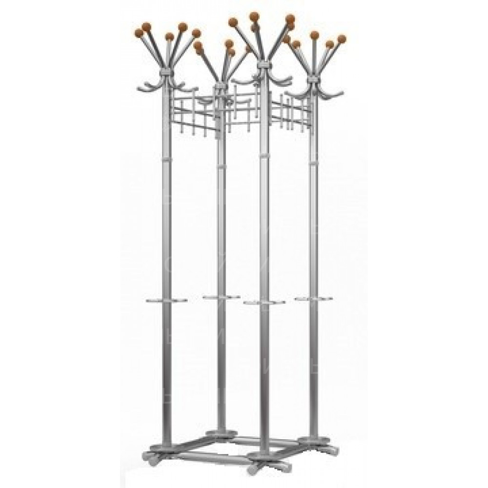 Вешалка гардеробная. Материал — стальная труба диаметром 38 мм. Поставляется в разобранном виде. 20 мест для размещения одежды и головных уборов. Подставка для зонтов. Нагрузка на верхний крючок для головных уборов — 1 кг. Максимально допустимая нагрузка — 64 кг.