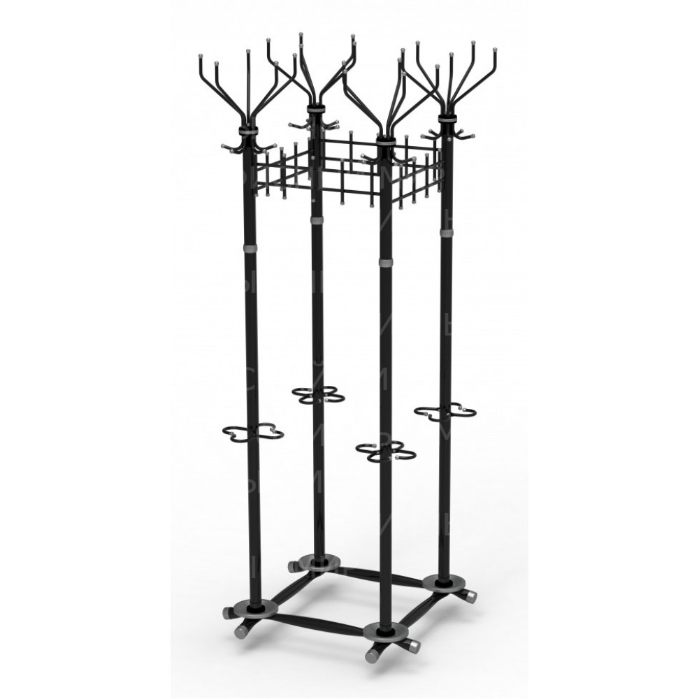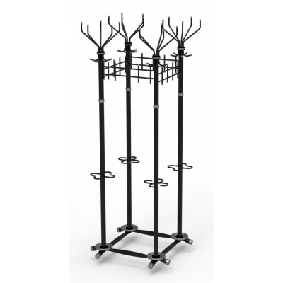 Удобная и вместительная вешалка позволяет компактно разместить большое количество одежды на четырех пятирожковых головах и четырех решетках, вертикальные штыри которых предназначены для подвешивания как одежды, так и сумок. Четыре полноценные зонтичницы с чашечками для сбора воды позволяют удобно размещать зонты-трости.