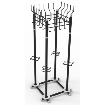 Вешалка гардеробная. Материал — стальная труба диаметром 38 мм. Поставляется в разобранном виде. 20 мест для размещения одежды и головных уборов. Подставка для зонтов. Нагрузка на верхний крючок для головных уборов — 1 кг. Максимально допустимая нагрузка — 64 кг. Цвет в ассортименте.